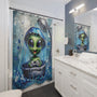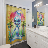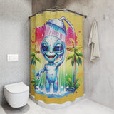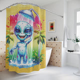 L'image d'un alien sous la douche dans un décor tropical est une célébration de l'imagination et de la joie de vivre. Elle fusionne le mystère de l'espace avec la détente des vacances, créant une scène décalée et pleine de bonne humeur. Ce rideau de douche est une invitation à rire et à apporter de la couleur et de la fantaisie à votre quotidien.