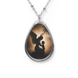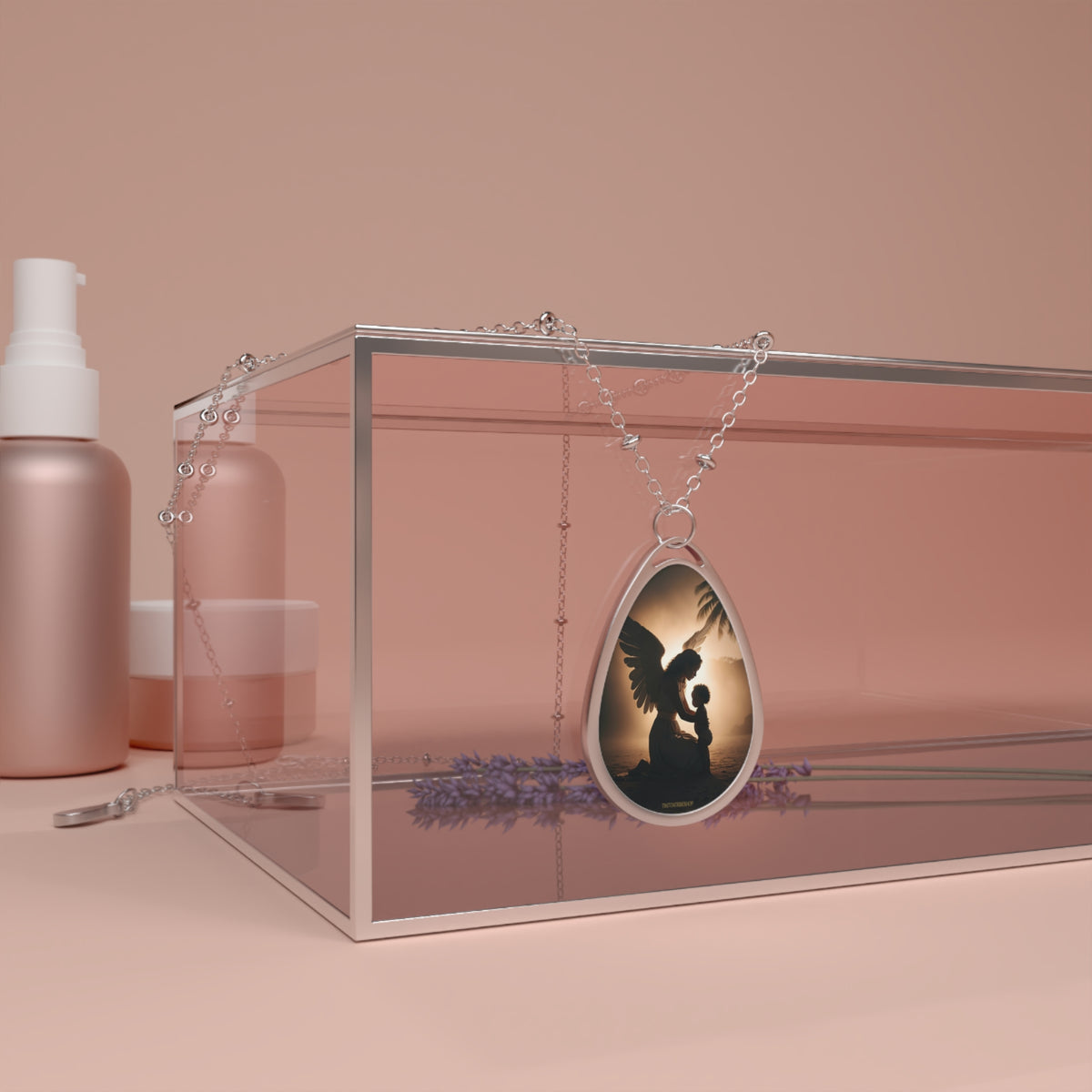 • Un pendentif inspiré de la foi, représentant un ange protecteur protégeant doucement un petit enfant en bas âge.