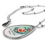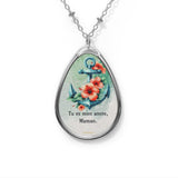 Ce pendentif est une pièce de bijouterie à la fois artistique et profondément sentimentale, conçue pour honorer la figure maternelle et la stabilité qu'elle représente. Sa forme ovale, encadrée d'un contour argenté brillant, met en valeur un design éclatant et serein. Au centre, une ancre stylisée, d'un beau bleu-vert, est magnifiquement ornée de grappes de fleurs d'hibiscus aux pétales rouges-orangés vifs et de feuilles vertes luxuriantes. L'arrière-plan est d'un vert d'eau doux avec des motifs végétaux subtils, créant une ambiance tropicale et apaisante. Le message "Tu es mon ancre, Maman." est inscrit de manière claire et élégante en bas du pendentif, ajoutant une touche personnelle et pleine de tendresse à ce bijou déjà symbolique.