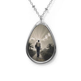 • Ce pendentif capture la silhouette d'un jeune homme revenant vers une lumière douce, suggérant la fin d'un voyage significatif.