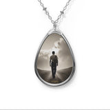 • Un pendentif ovale émouvant, représentant la silhouette d'un jeune homme marchant sur un chemin, le dos tourné, sous un ciel nuageux mais teinté d'espoir.