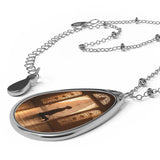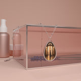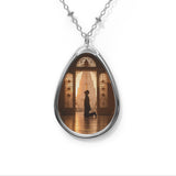 • Pendentif en forme de goutte d’eau, illustrant un homme en prière face à un temple sacré.