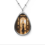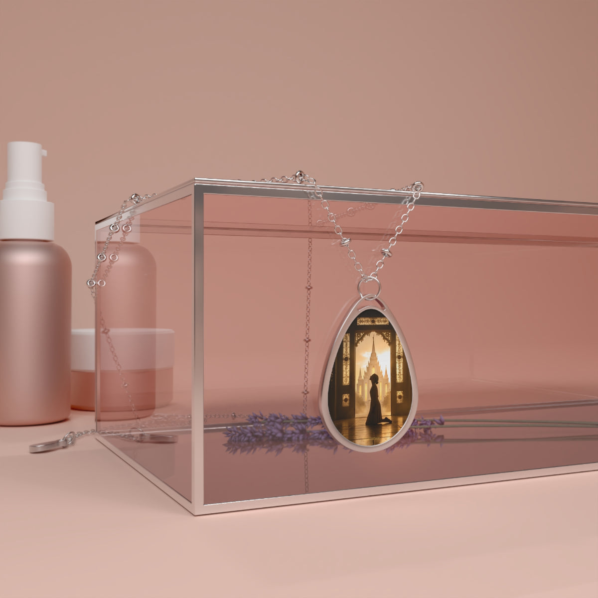 • Un pendentif en forme de goutte d’eau reprĂ©sentant une silhouette fĂ©minine en priĂšre devant un temple sacrĂ©.