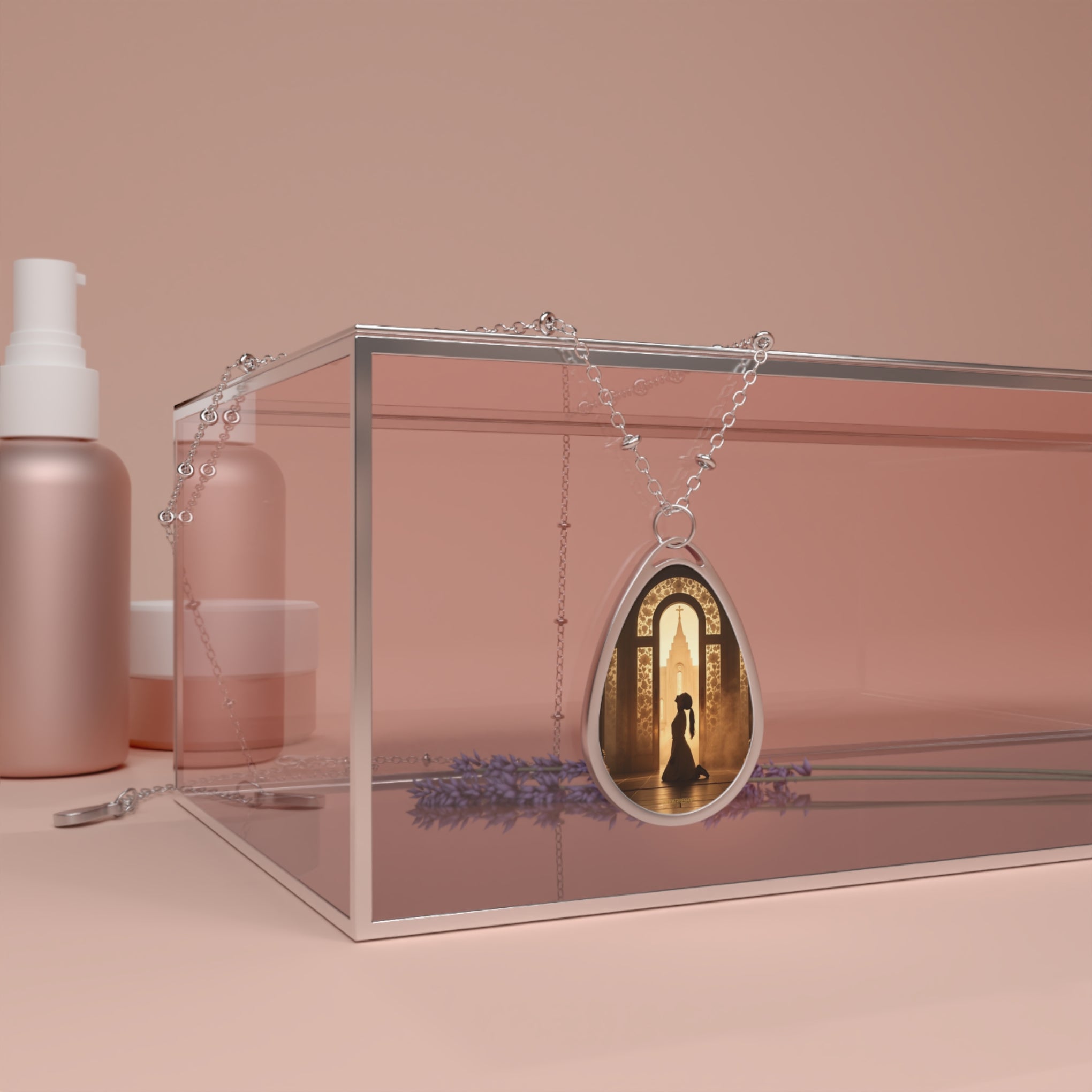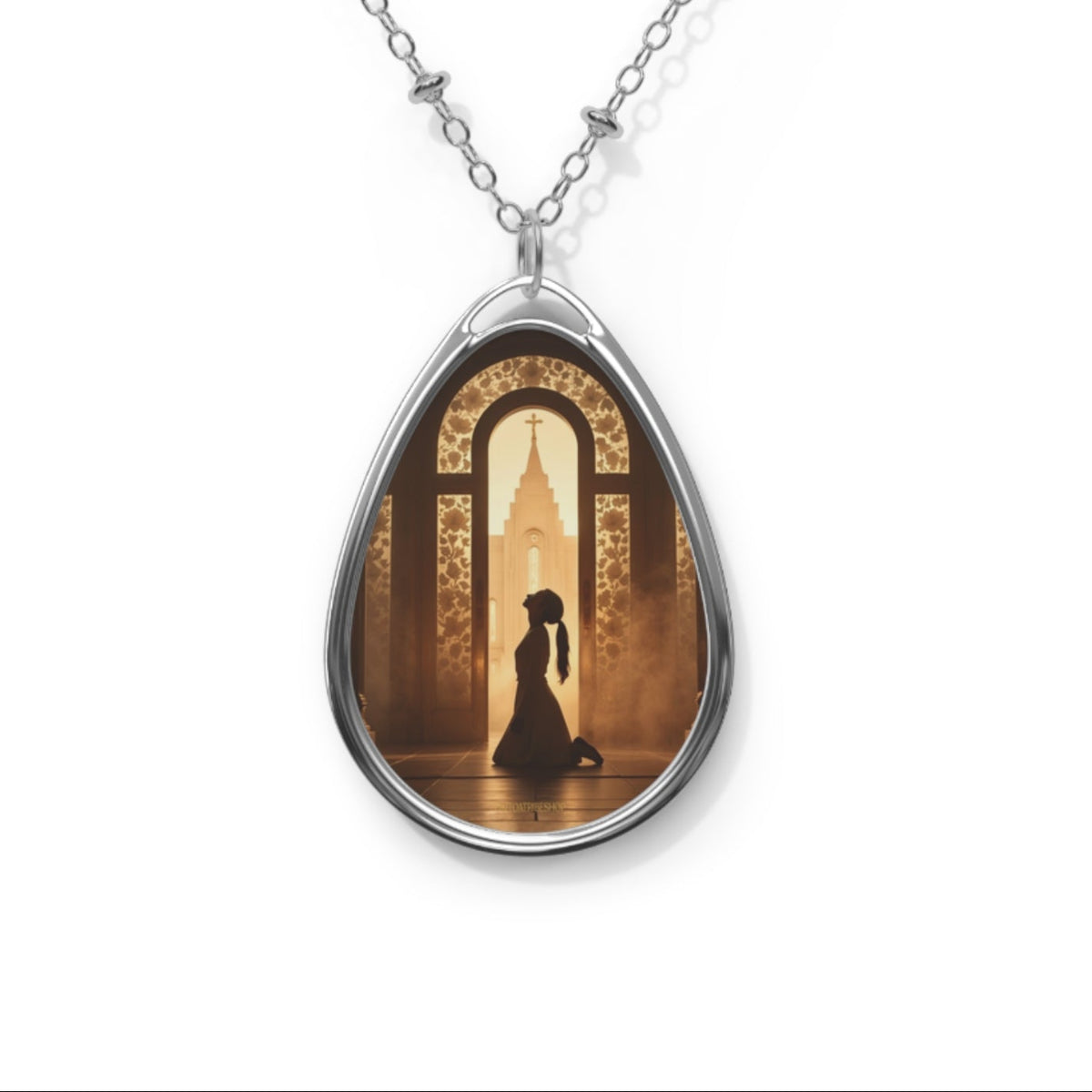 Dans la tradition chrétienne, l’arche est un symbole de passage, de protection et de bénédiction. Dans cette illustration, la jeune fille s’agenouille face à cette arche comme on entre dans une nouvelle étape de vie. La croix surplombant le sanctuaire rappelle l’amour inconditionnel du Christ, tandis que la lumière douce évoque la paix intérieure que seule la foi peut offrir. Ce pendentif devient alors un refuge spirituel miniature, un rappel discret mais puissant de ta force intérieure, de ton identité en Christ et de ton chemin lumineux.