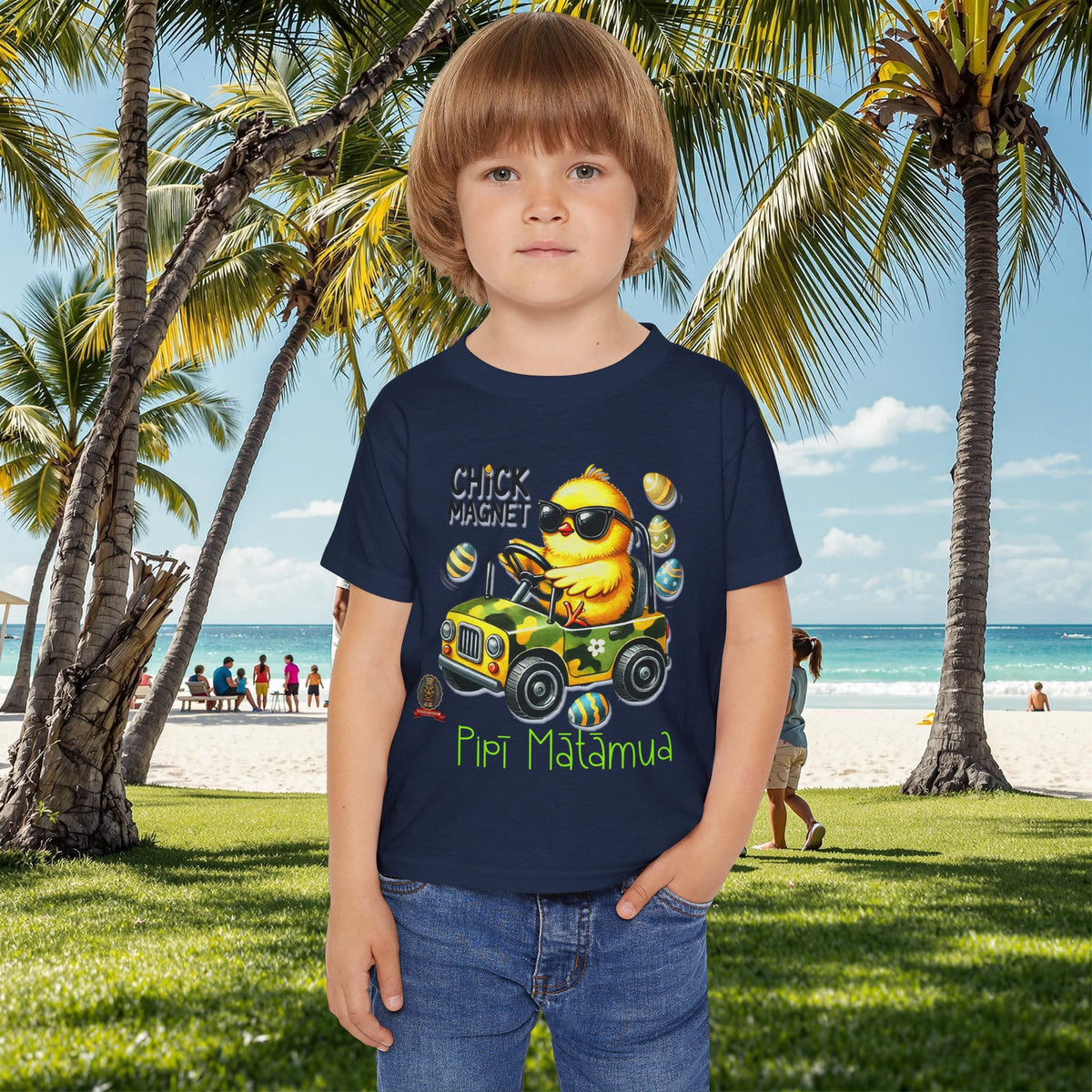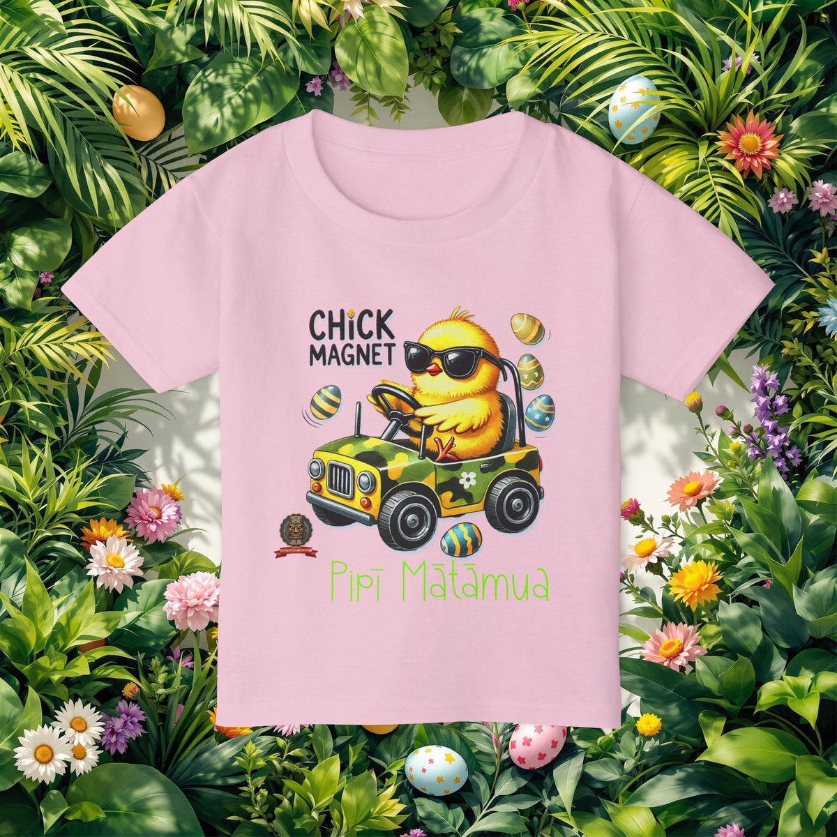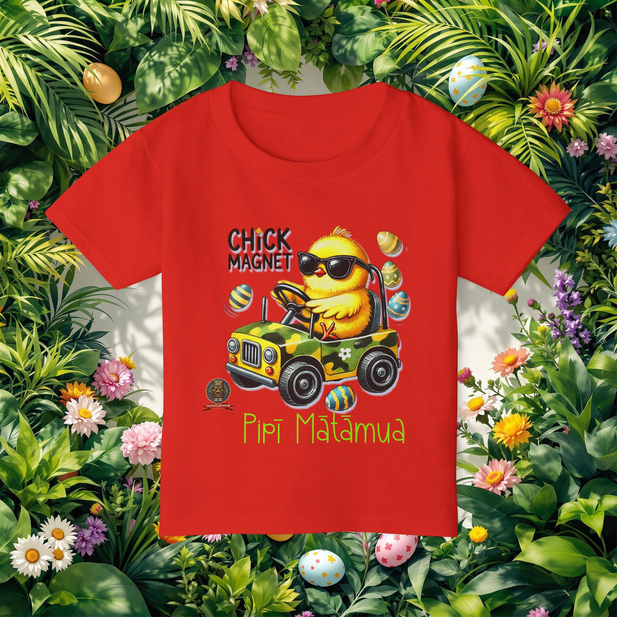 Saviez-vous que ce T-shirt porte un message d'humour et une signification profonde ? La phrase "CHICK MAGNET" est une expression argotique amusante qui se traduit par "attire les filles", mais dans ce contexte, avec un poussin au volant, c'est un jeu de mots espiègle qui ne manquera pas de faire sourire. Cependant, le design va plus loin avec la phrase "Pipi Mātāmua" en bas du t-shirt. "Pipi" est un mot maori qui peut désigner un "poussin", tandis que "Mātāmua" signifie "premier-né" ou "le premier".