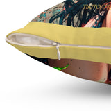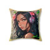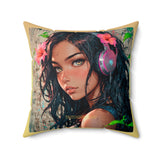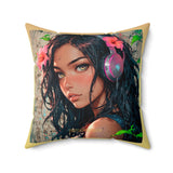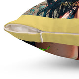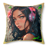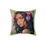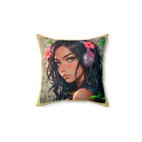 • Un coussin carré au design poétique, présentant le portrait d'une jeune personne aux longs cheveux foncés et aux yeux ambrés captivants.
