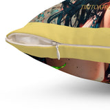 Ce coussin "Rêve Ambré : Mélodie Tropicale" est une invitation à la sérénité et à la rêverie. L'image dépeint une jeune femme aux traits doux et aux yeux clairs, ornée de fleurs tropicales, écoutant de la musique dans un cadre rappelant une jungle luxuriante et baignée d'une lumière chaude, presque ambrée. Les couleurs vibrantes des fleurs contrastent avec la douceur des tons de peau et de la végétation, créant une atmosphère à la fois exotique et apaisante. Ce coussin n'est pas qu'un simple objet de décoration ; il est une fenêtre ouverte sur un monde de calme, de beauté naturelle et d'harmonie, apportant une touche de chaleur et de poésie à votre intérieur.