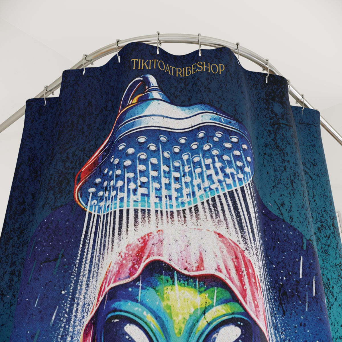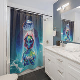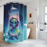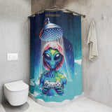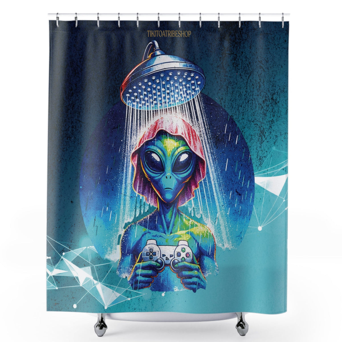 Ce rideau de douche "Évasion Galactique : L'Alien Gamer" est une pièce audacieuse et amusante, parfaite pour ajouter une touche d'originalité et d'humour à votre salle de bain. Il présente une illustration captivante d'un extraterrestre aux grands yeux et à la peau aux teintes vertes et bleues, sous une douche. L'alien tient une manette de jeu vidéo, créant une scène décalée et pleine de personnalité. Le fond est un mélange de noir profond et de bleus lumineux, avec des éléments géométriques rappelant un portail spatial ou un univers numérique. L'ensemble dégage une ambiance à la fois futuriste et fantaisiste. Ce rideau de douche n'est pas qu'un simple accessoire fonctionnel ; il est une véritable œuvre d'art qui transformera votre salle de bain en un espace unique et divertissant. Il est parfait pour les passionnés de science-fiction, de jeux vidéo et pour tous ceux qui aiment l'originalité et les touches d'humour dans leur décoration intérieure.