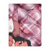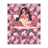 Les cœurs sont des symboles universels de l'amour et du bonheur, et leur représentation en volume ou en aspect "cristallin" sur ce plaid, avec des reflets de lumière, renforce l'idée d'un bonheur précieux et éclatant. L'expression "J'peux pas, j'ai plaid !" associée à ce motif lumineux, transforme la simple action de se reposer en un moment de pure magie et de ressourcement. Le plaid devient non seulement un bouclier contre les tracas du monde extérieur, mais aussi une bulle enchantée où le confort physique se mêle à une ambiance visuellement apaisante et joyeuse, comme si chaque cœur représentait un instant de bien-être pur et brillant.