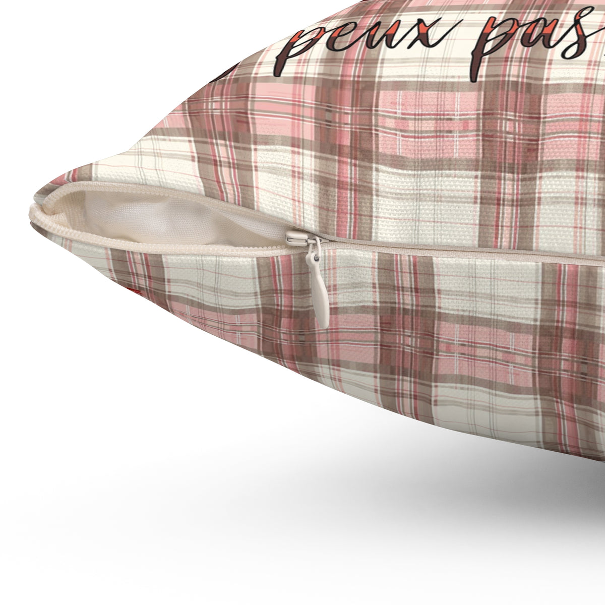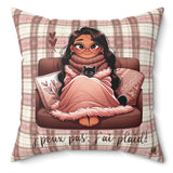 Ce coussin "Je peux pas, j'ai plaid!" est une illustration craquante de cette tendance. Il met en scène une jeune femme aux lunettes rondes, confortablement emmitouflée dans un plaid douillet, assise sur un canapé, avec un petit chat noir à ses côtés. L'arrière-plan présente un motif à carreaux rose et blanc, qui s'harmonise avec le plaid, et l'expression humoristique "Je peux pas. J'ai plaid!" est inscrite en bas. L'illustration est dans un style doux et kawaii, avec des couleurs pastel et une ambiance cosy. Ce coussin n'est pas qu'un simple objet de décoration ; il est un message amusant et réconfortant, apportant une touche de fantaisie, de confort et d'humour à votre intérieur.