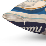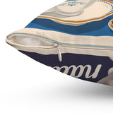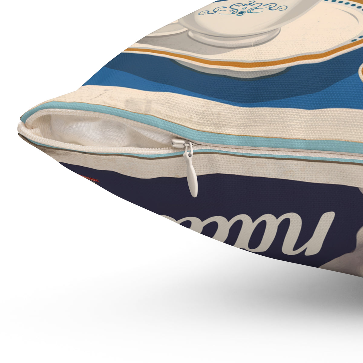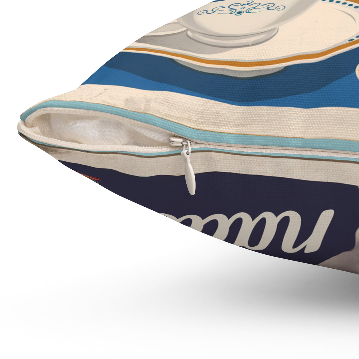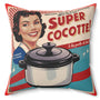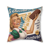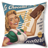 • Coussin Déco Carré à Housse Imprimée : Il présente une illustration délicate d'une femme aux boucles parfaites et au sourire éclatant, typique des affiches publicitaires des années 40-50. Le design intègre des éléments iconiques comme une tasse de café fumante et une tablette de chocolat, accompagnés de slogans accrocheurs. Les couleurs pastel, les teintes terreuses et les bleus doux créent une palette apaisante.
