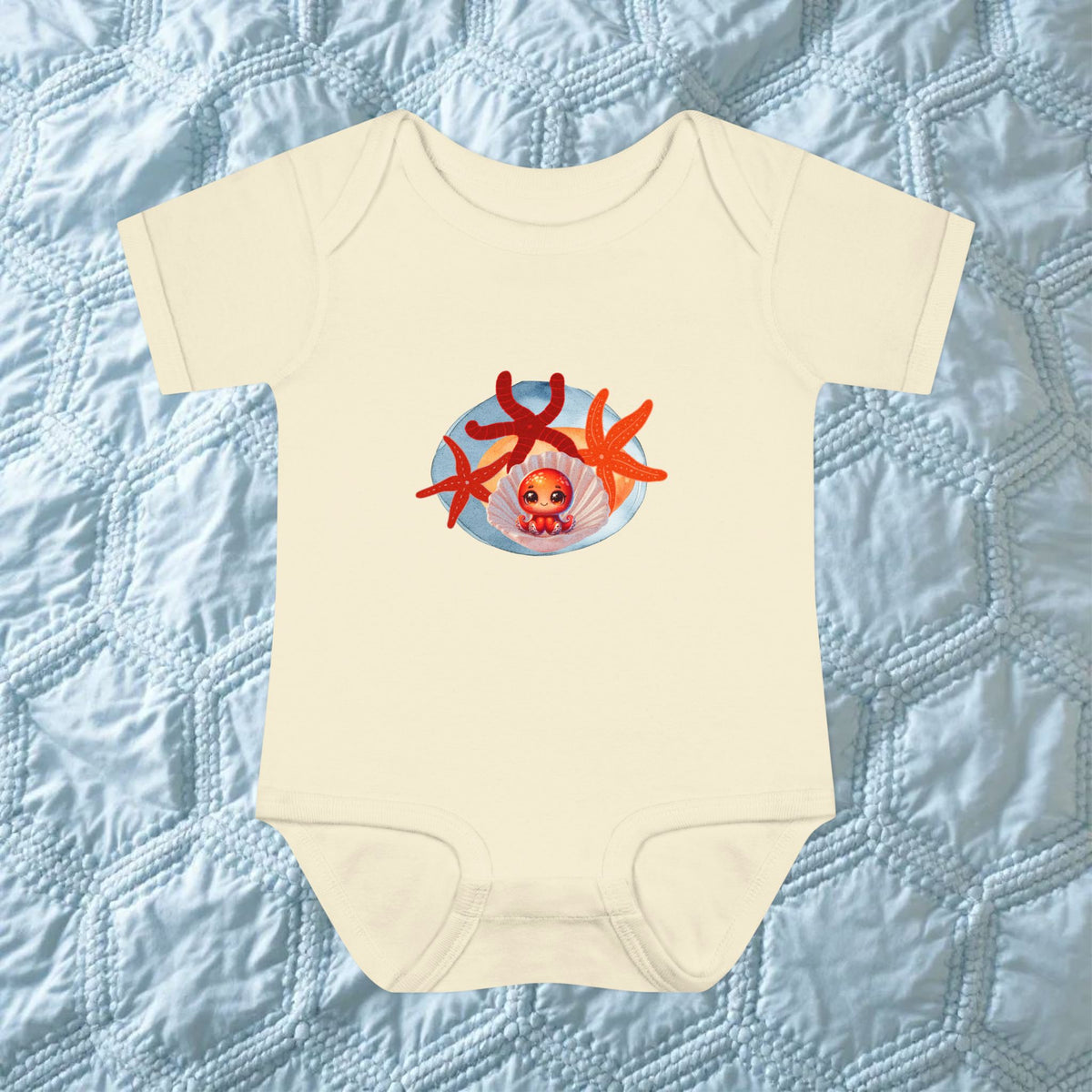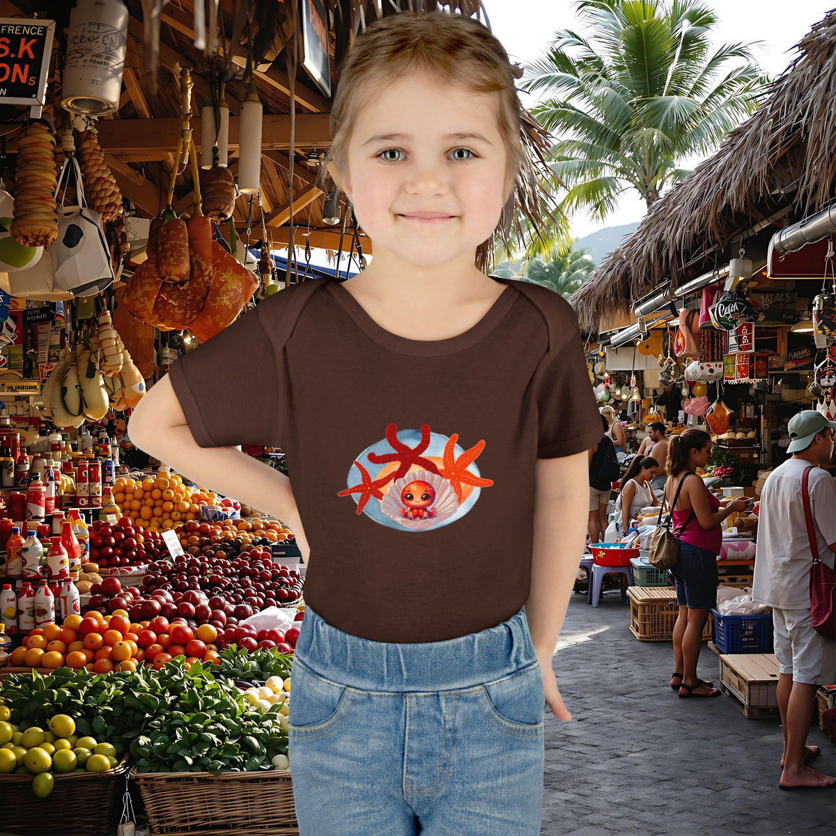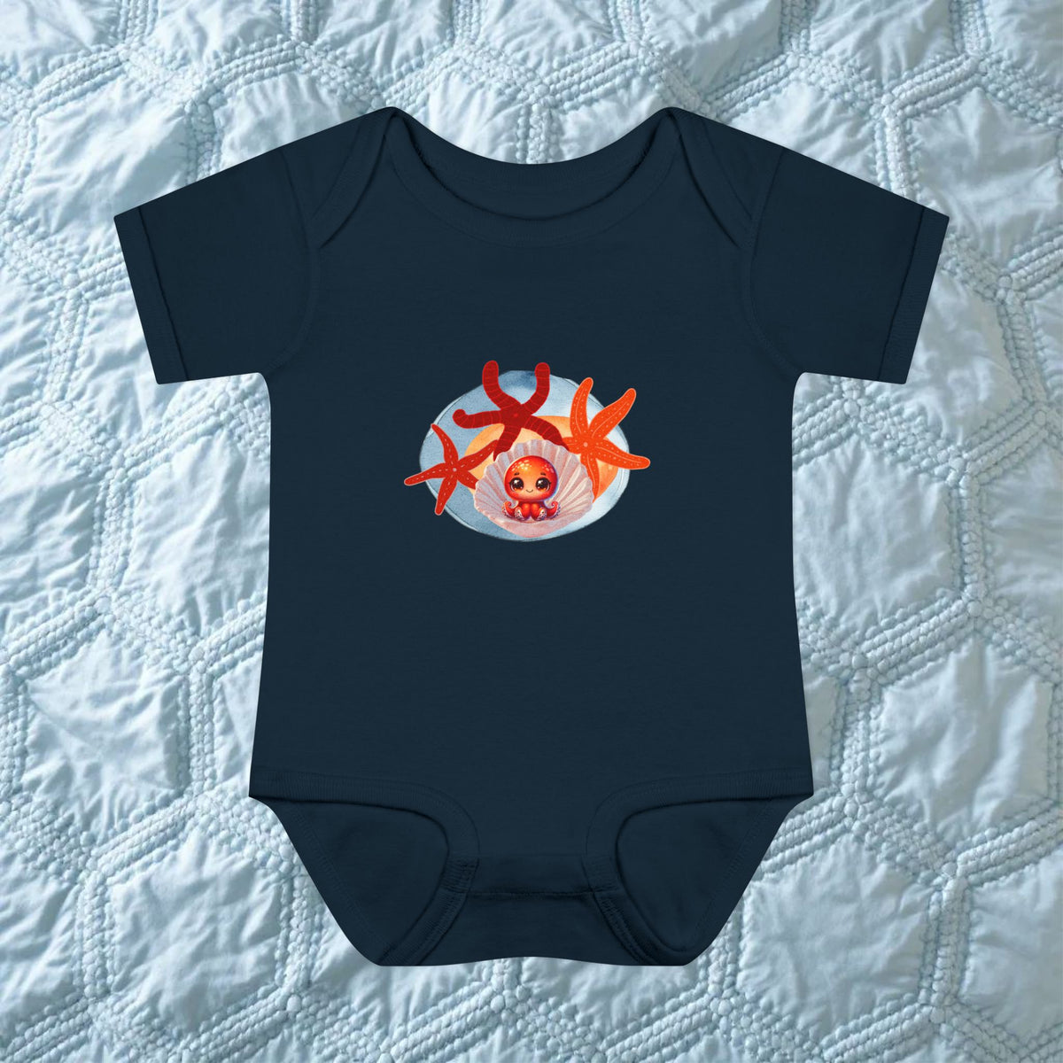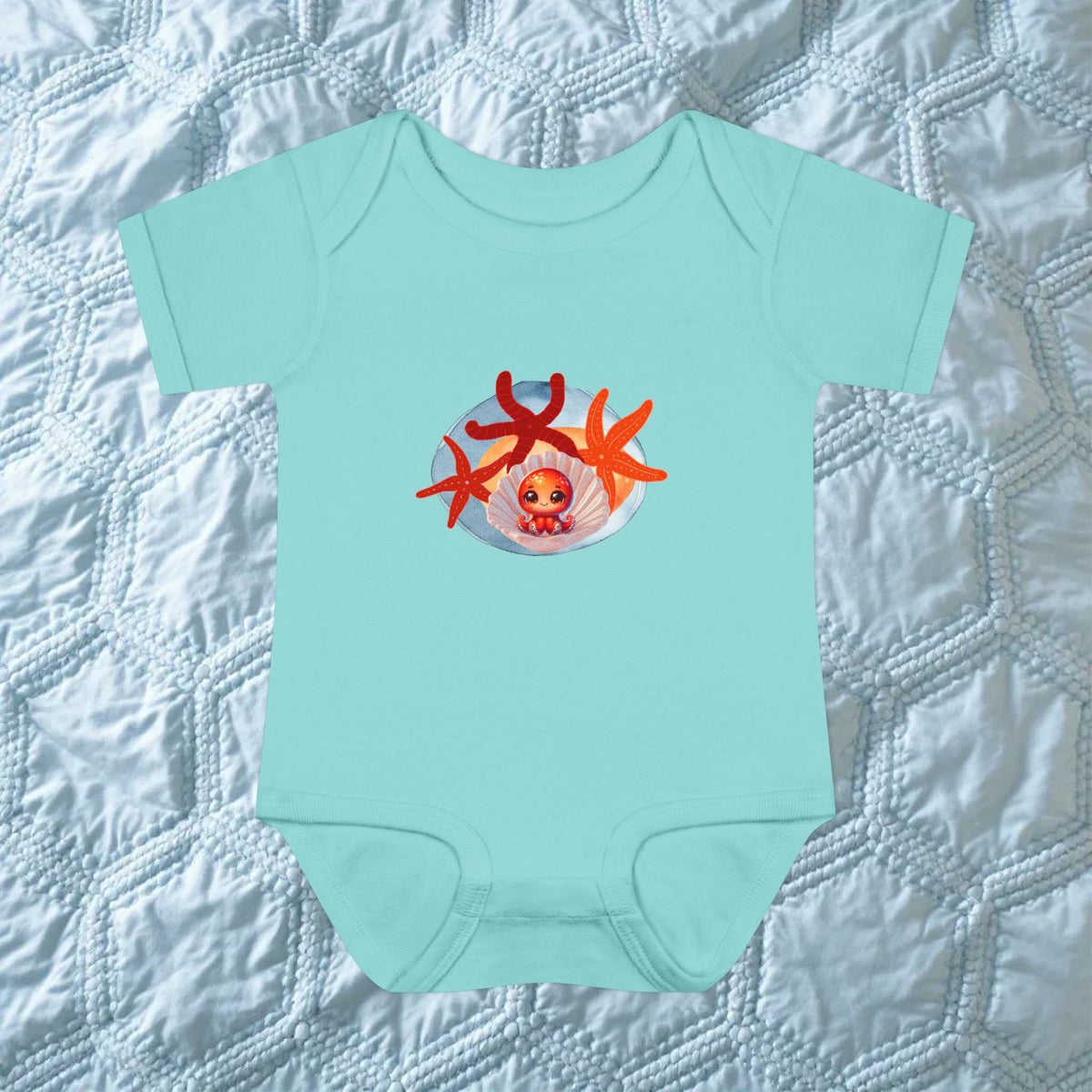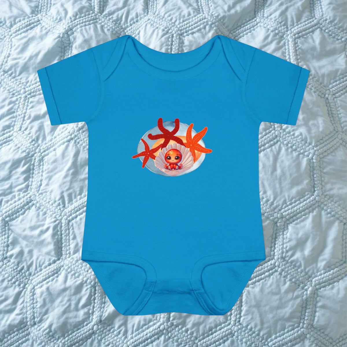 • Design PrĂ©cieux et Doux : Ce body met en scĂšne un adorable petit habitant des mers (comme un petit poulpe ou une crĂ©ature marine stylisĂ©e) dĂ©licatement posĂ© dans un coquillage, entourĂ© d'Ă©toiles de mer. Ce motif Ă©voque un abri sĂ»r et prĂ©cieux, symbolisant la protection et le dĂ©but d'une vie merveilleuse, tel un trĂ©sor dĂ©couvert dans les profondeurs.