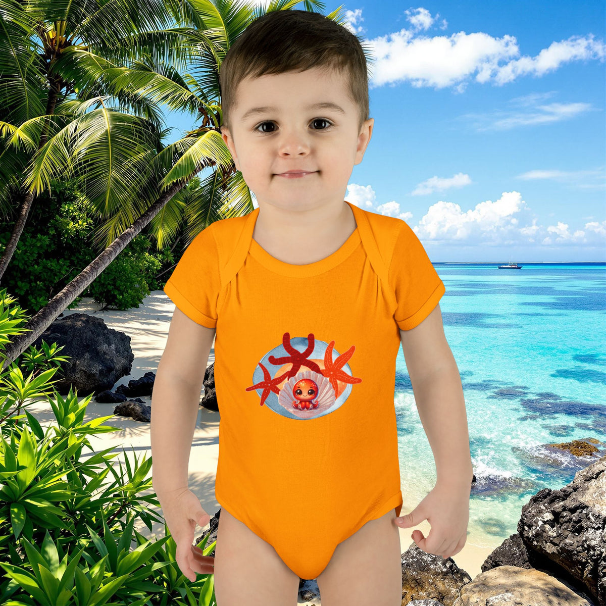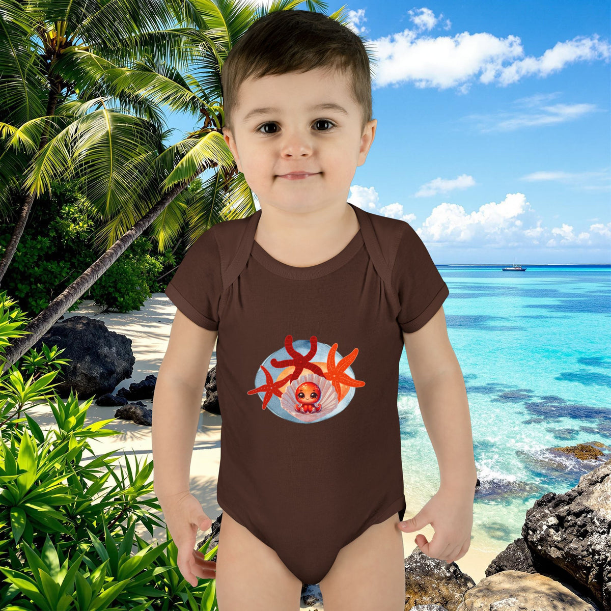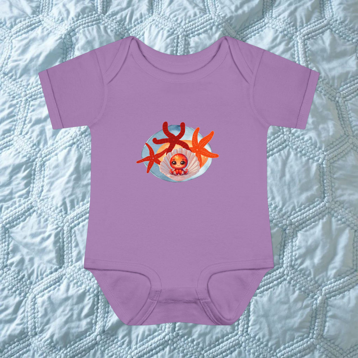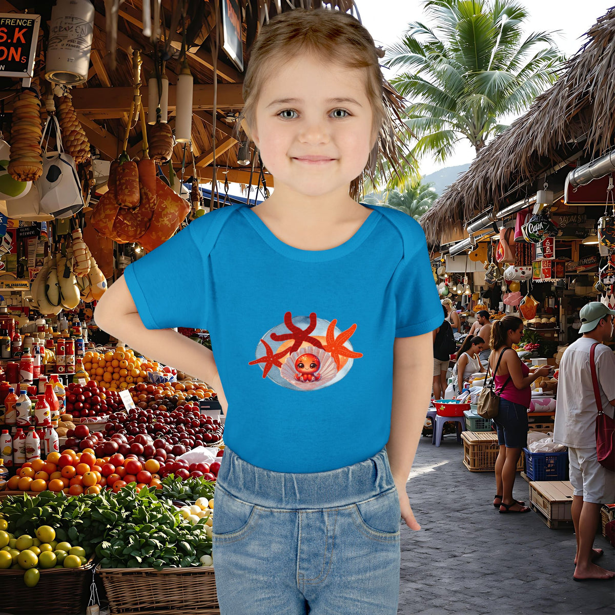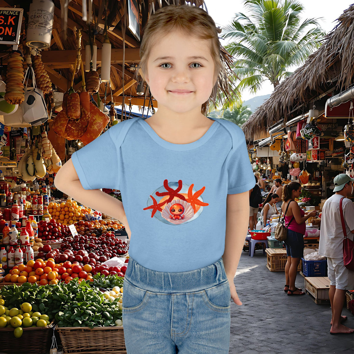 • Design PrĂ©cieux et Doux : Ce body met en scĂšne un adorable petit habitant des mers (comme un petit poulpe ou une crĂ©ature marine stylisĂ©e) dĂ©licatement posĂ© dans un coquillage, entourĂ© d'Ă©toiles de mer. Ce motif Ă©voque un abri sĂ»r et prĂ©cieux, symbolisant la protection et le dĂ©but d'une vie merveilleuse, tel un trĂ©sor dĂ©couvert dans les profondeurs.