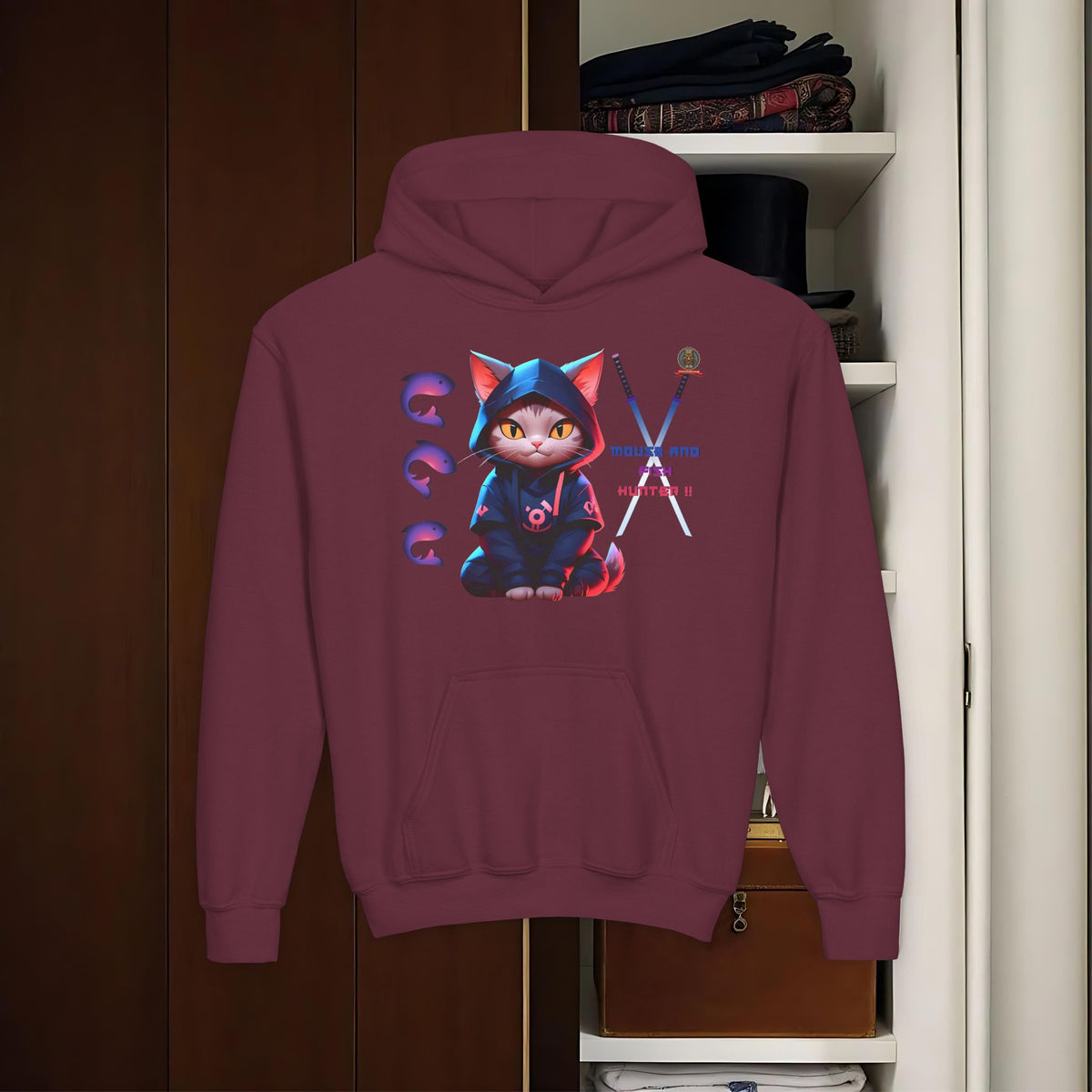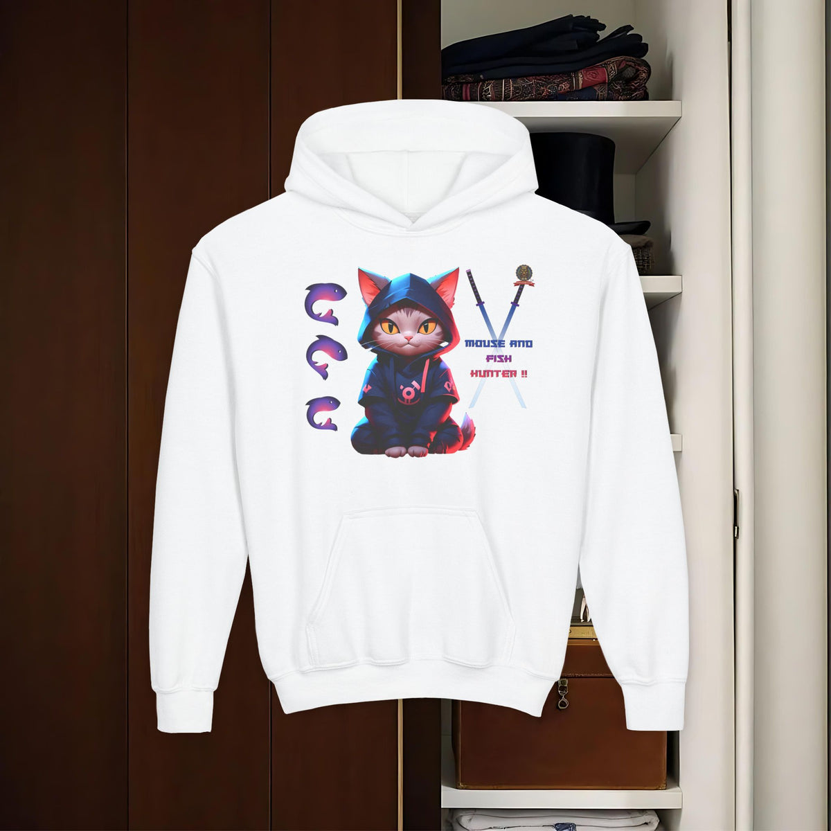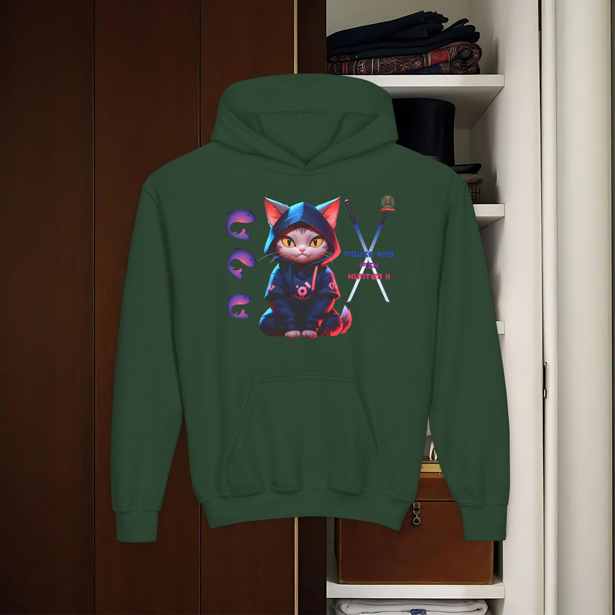 Affirmez votre instinct de prédateur urbain avec le Hoody Ninja Chat : Chasseur Urbain de TIKI TOA TRIBE SHOP ! Ce hoody est fait pour ceux qui excellent dans l'art de la poursuite discrÚte, avec son message clair : 'MOUSE AND FISH HUNTER'.