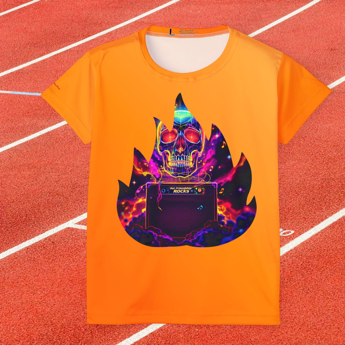Plongez dans l'énergie brute du rock avec notre maillot de sport "Fiery Rock". Ce jersey athleisure est idéal pour les esprits passionnés qui veulent un style aussi flamboyant que leur musique préférée. Son fond orange vif met en valeur un design spectaculaire : un crâne en feu aux couleurs psychédéliques, avec des guitares et un ampli. Fabriqué en 100% polyester anti-humidité, il vous garde au frais et au sec, même lorsque le rythme s'intensifie.