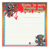 • 📏 3” x 3” (env. 7,6 x 7,3 cm) – format carré classique et compact. • 📏 4” x 4” (env. 10,2 x 9,8 cm) – pour plus de place pour tes notes. • 🌈 Couleurs éclatantes grâce aux techniques d’impression modernes. • 🌴 Bordures inspirées des motifs traditionnels et graphiques Tiki. • 🎨 Design fixe sur toutes les feuilles du bloc. Ce bloc-notes captivant arbore un design unique et vibrant, avec en son cœur, un puissant message en tahitien : "Eiaha 'ia mo'e" (N'oublie pas / Don't forget). Un Tiki dynamique brandissant un stylo domine le haut de la page, tandis qu'un autre, plus expressif, attire l'attention en bas, symbolisant la force et la mémoire. Le fond orange / jaune dégradé, parsemé de rayures à motifs et d'une bordure décorative, ajoute une touche d'authenticité et de couleur, faisant de chaque feuille une petite œuvre d'art.• 📏 3” x 3” (env. 7,6 x 7,3 cm) – format carré classique et compact.