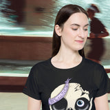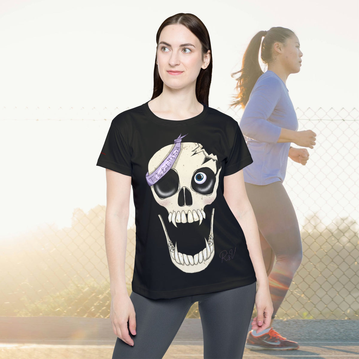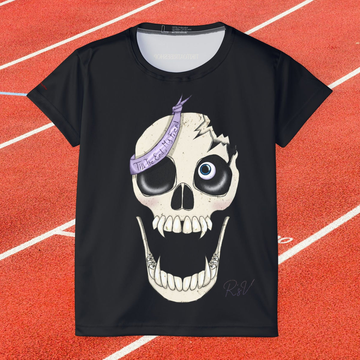 Le design central met en scène un crâne au style décalé, avec des yeux de différentes tailles et un ruban violet portant l'inscription "Till The End My Friend" ("Jusqu'à la fin, mon ami"). Ce crâne, à la fois mignon et légèrement effrayant, exprime un message de loyauté et d'amitié éternelle.