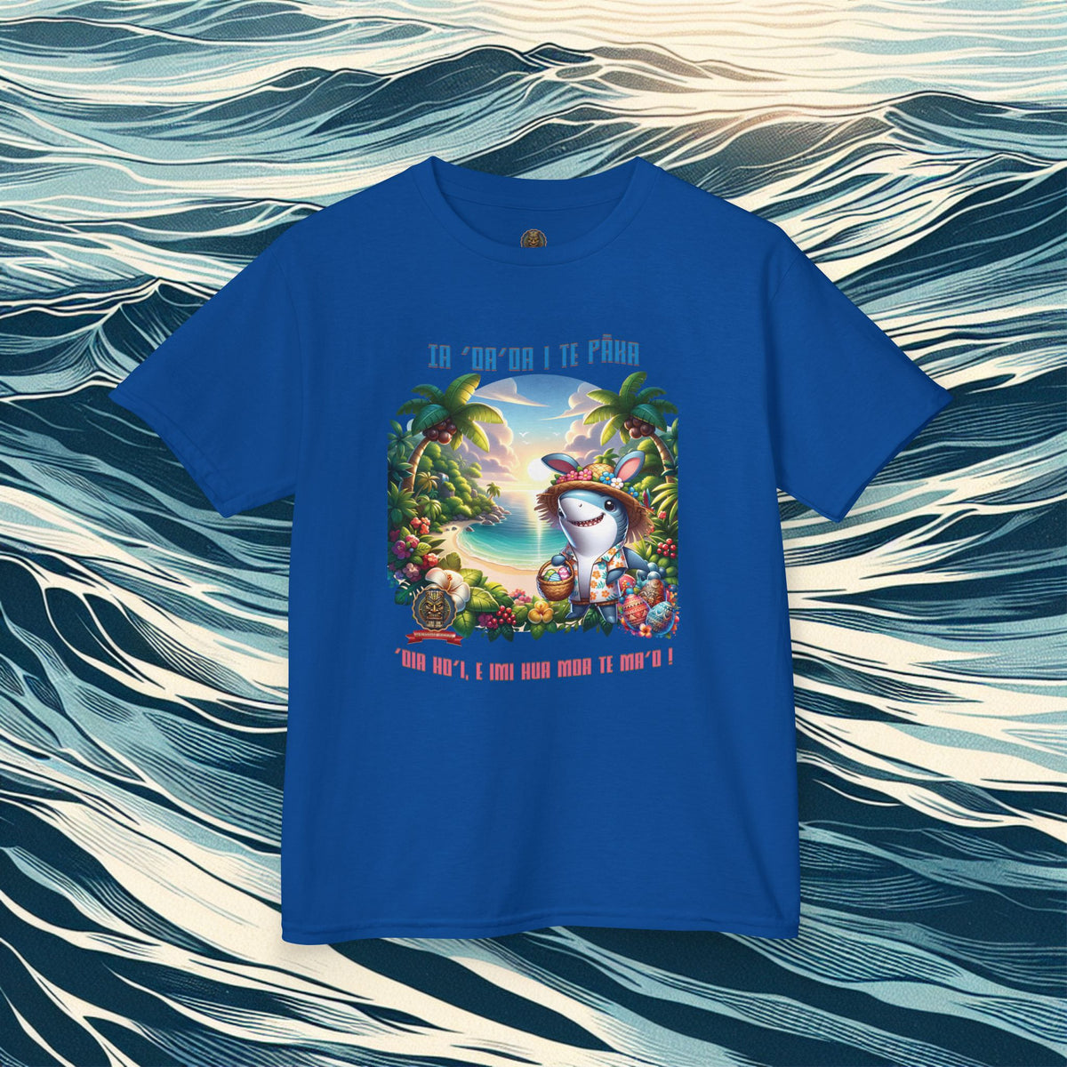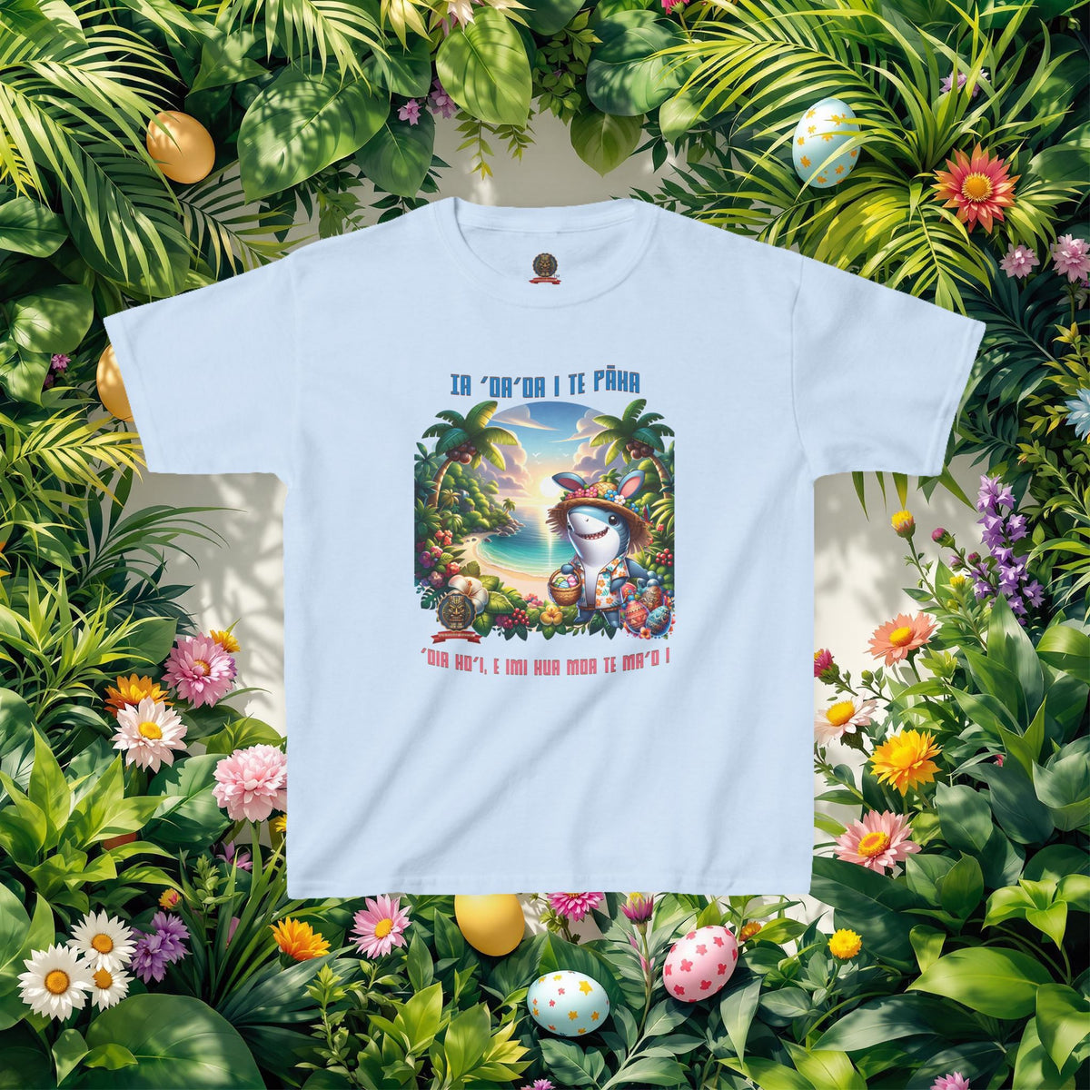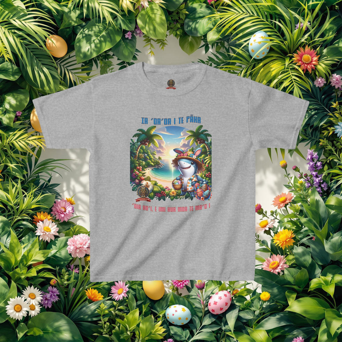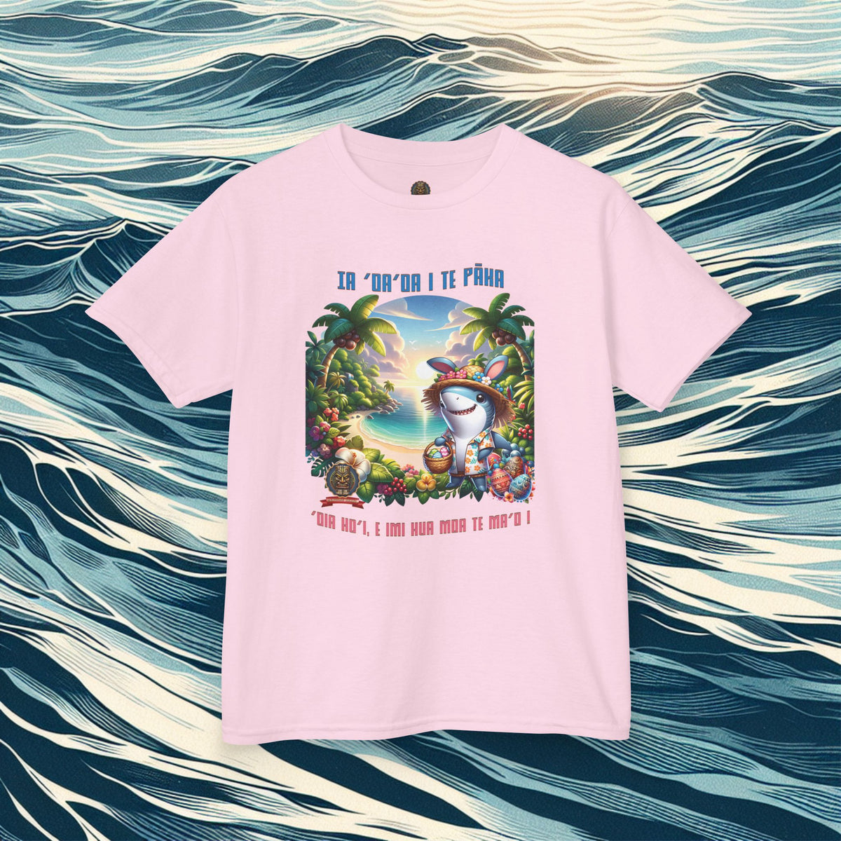 ”‘Ia ‘oa’oa i te Pāka – ‘oia ho’i, e imi hua moa te ma’o !” - (“Joyeuses Pâques en Polynésie – même les requins cherchent des œufs !”).