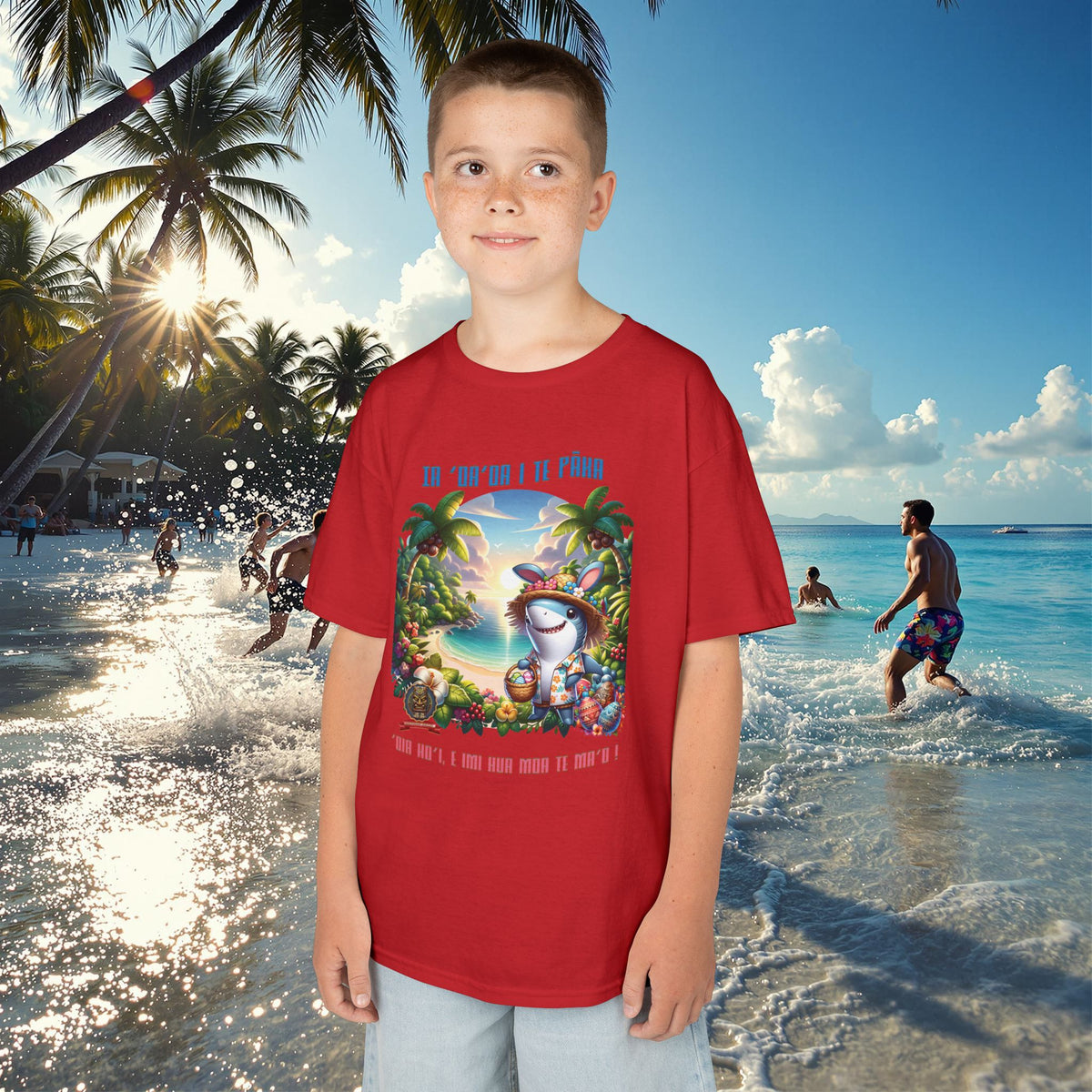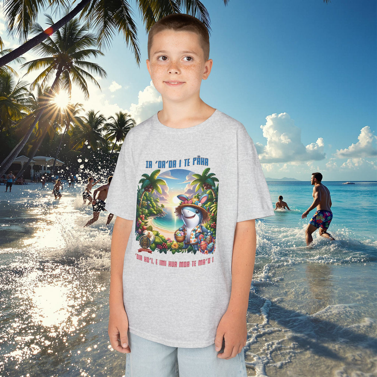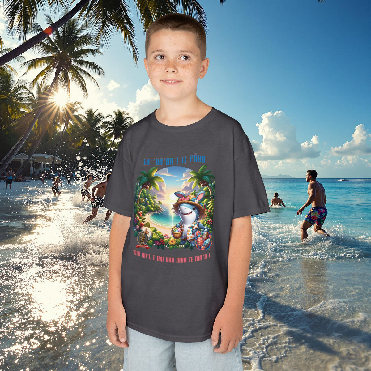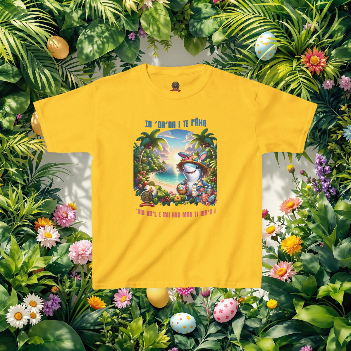 ”‘Ia ‘oa’oa i te Pāka – ‘oia ho’i, e imi hua moa te ma’o !” - (“Joyeuses Pâques en Polynésie – même les requins cherchent des œufs !”).