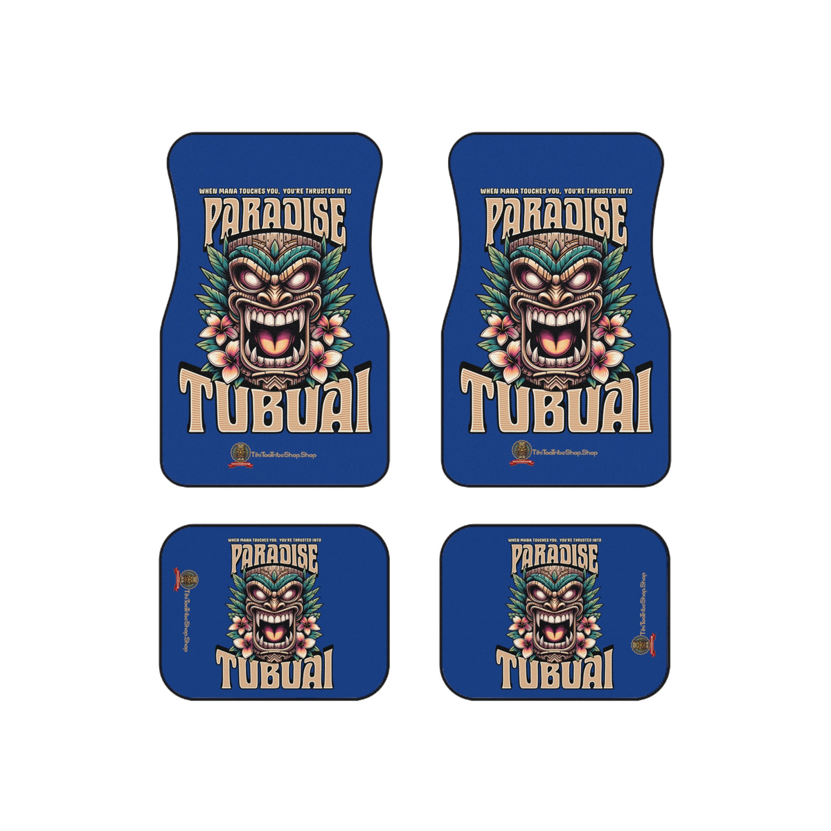 Inscription "Tubuai" en lettres stylisées, évoquant l’île paisible des Australes, entre montagnes verdoyantes et lagons turquoise.