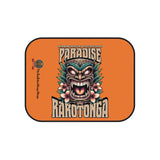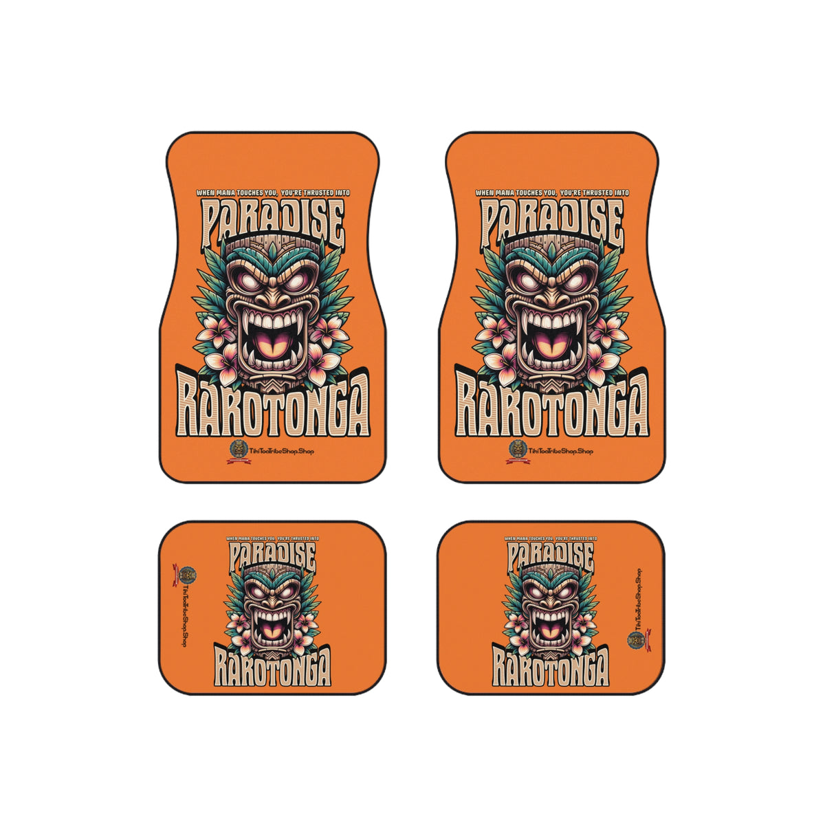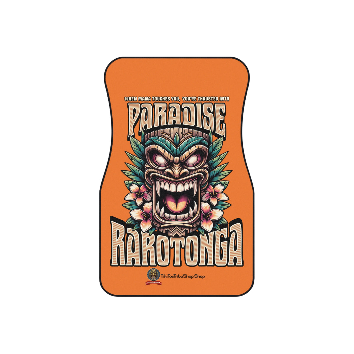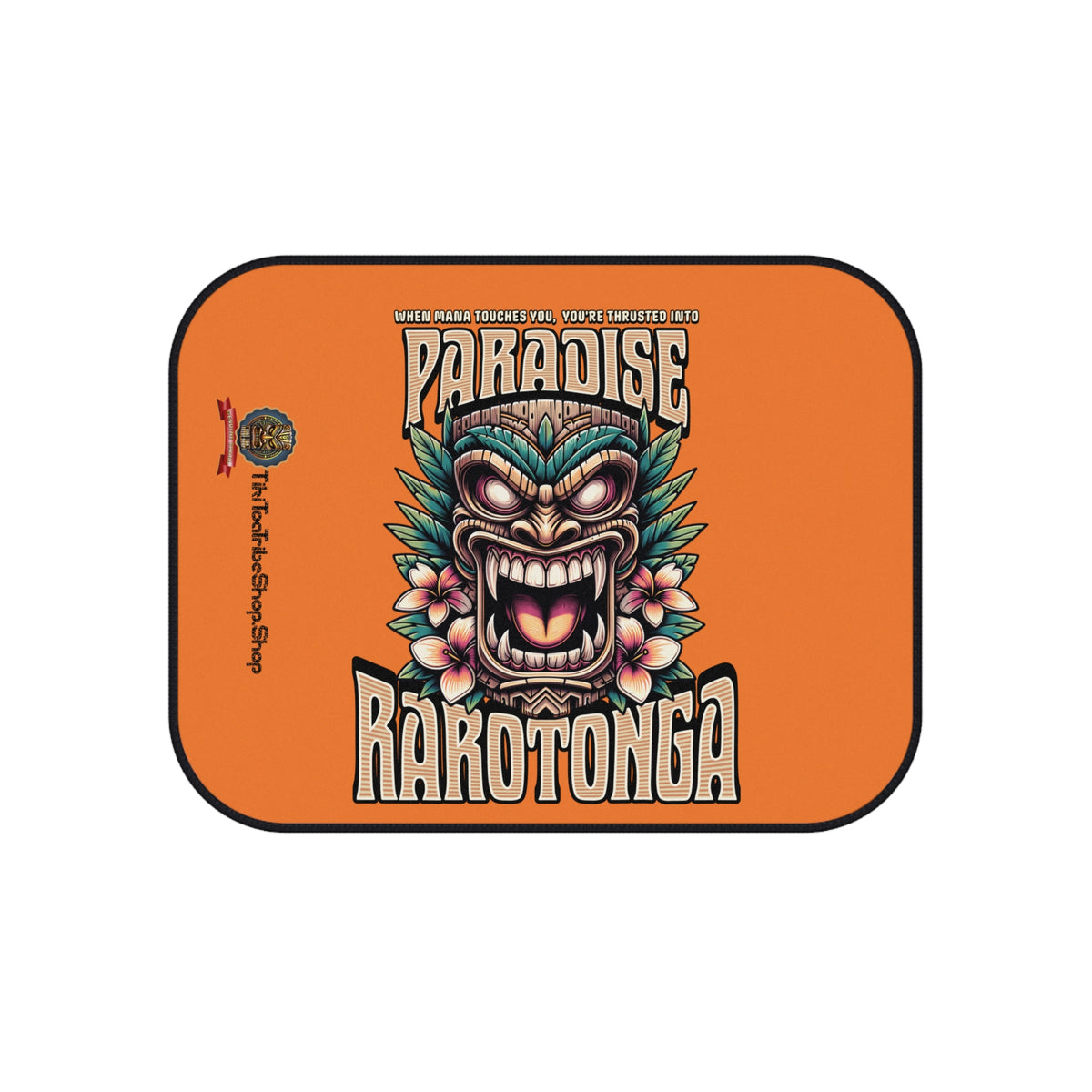 Inscription "Rarotonga" en lettres stylisées, célébrant l’île principale des Îles Cook, entre montagnes luxuriantes et lagons bleutés.