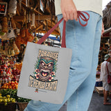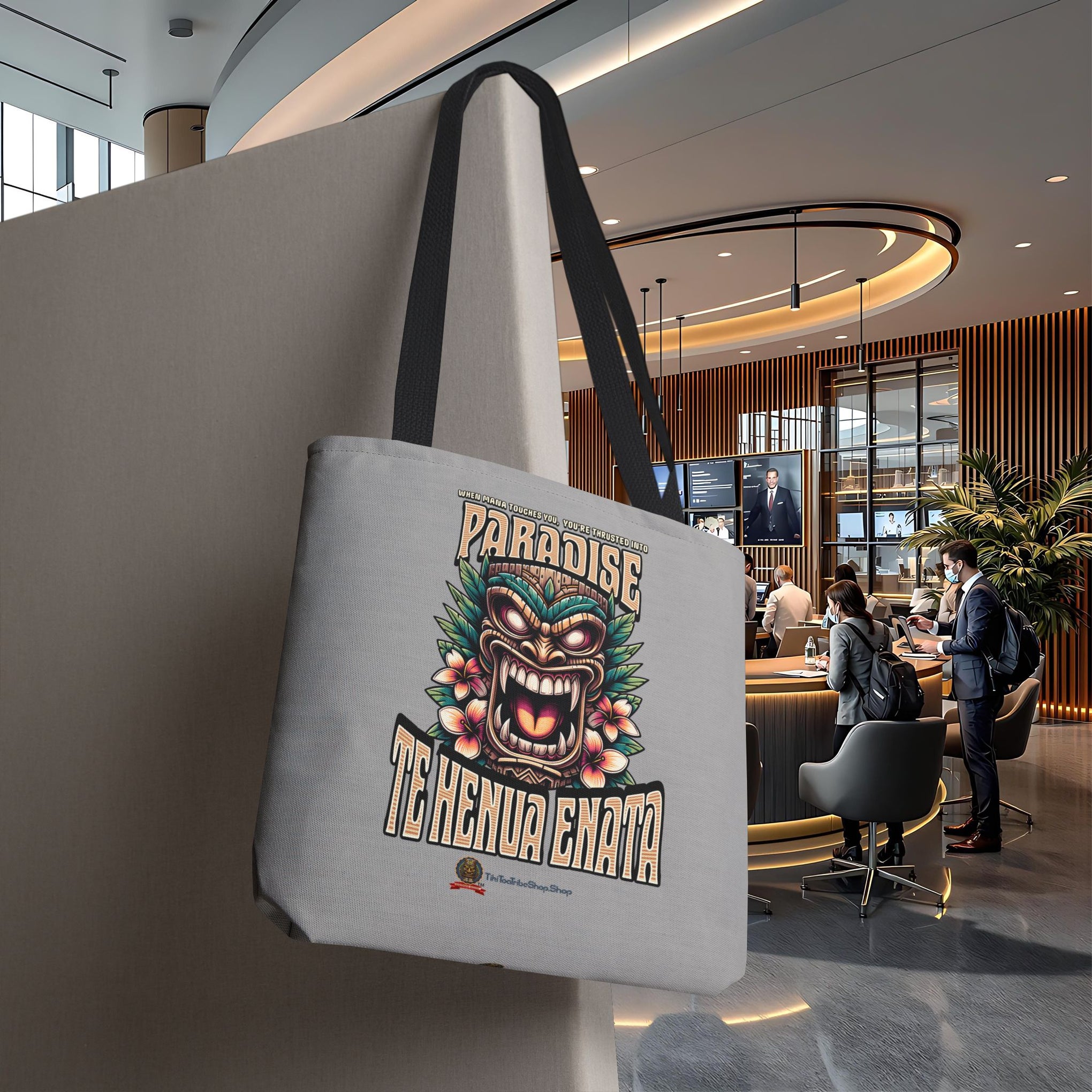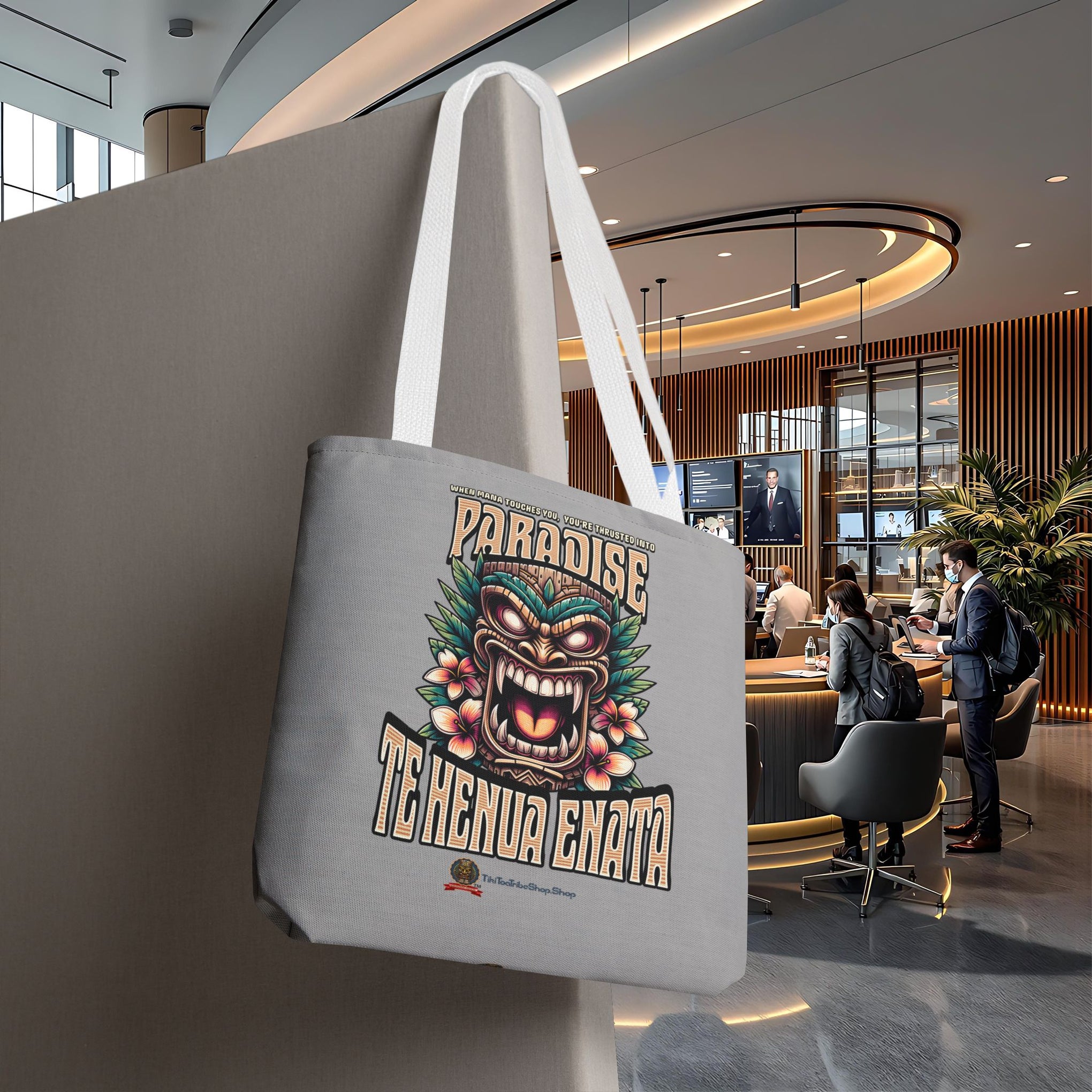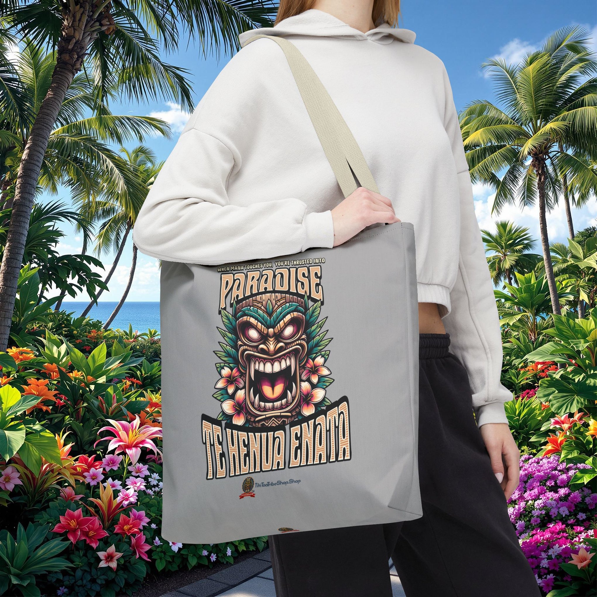 Emportez la beauté sereine et l'esprit des Marquises avec le Tote Bag 'TE HENUA ENATA PARADISE' Gris Doux de TIKI TOA TRIBE SHOP. Votre paradis personnel, avec une touche de calme et de force, vous attend !