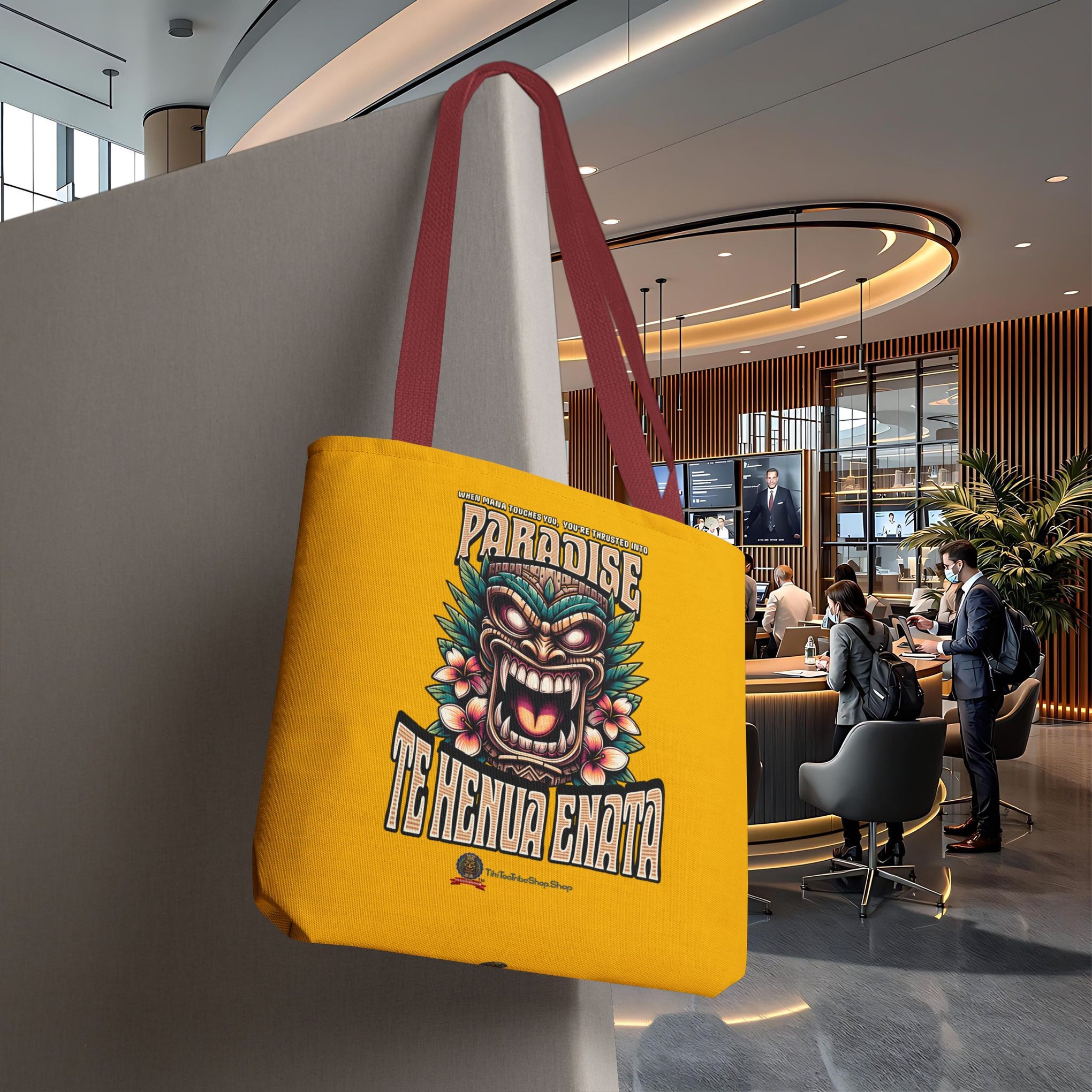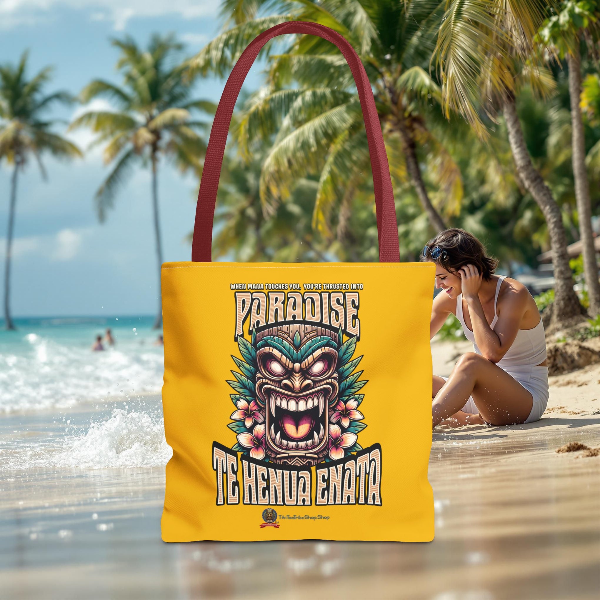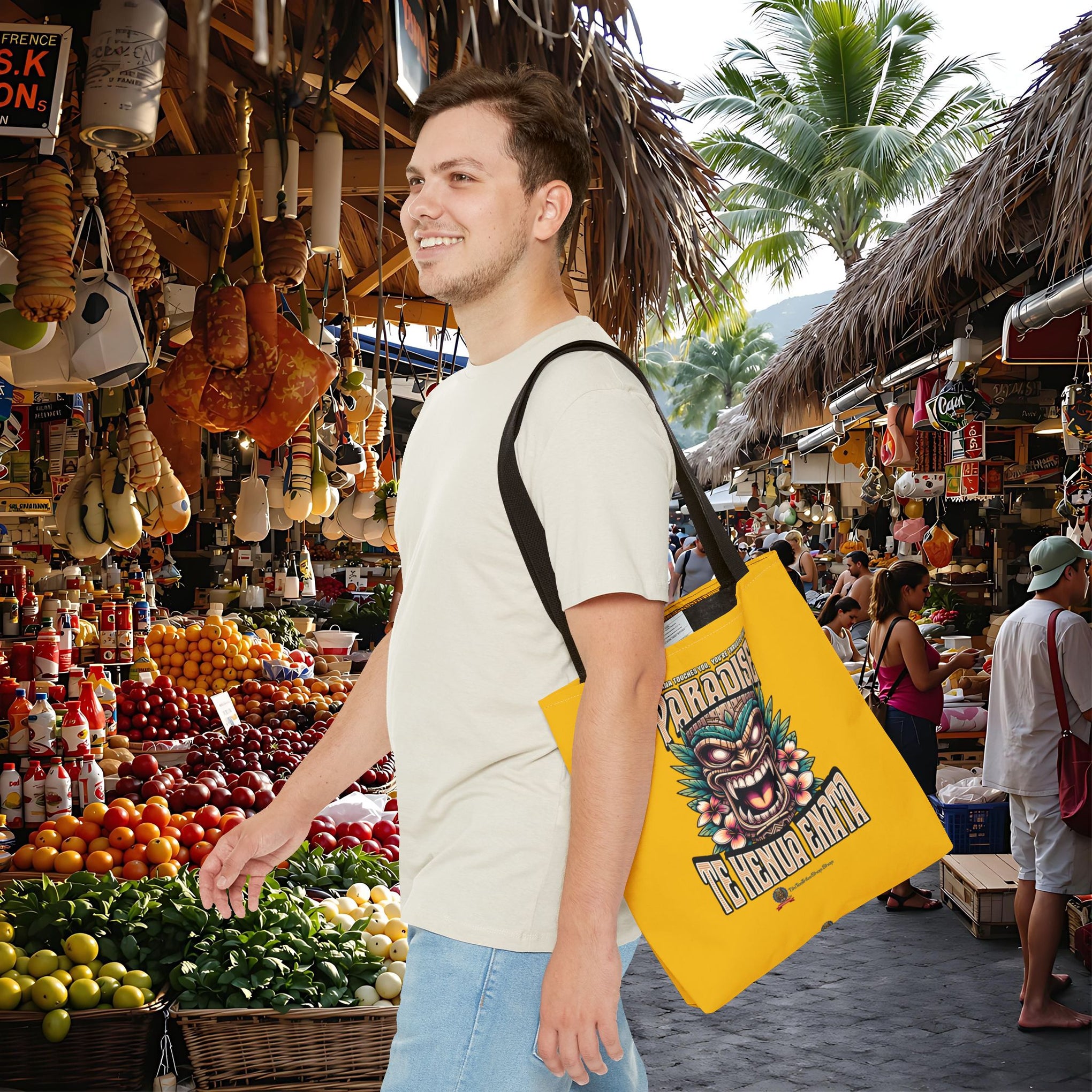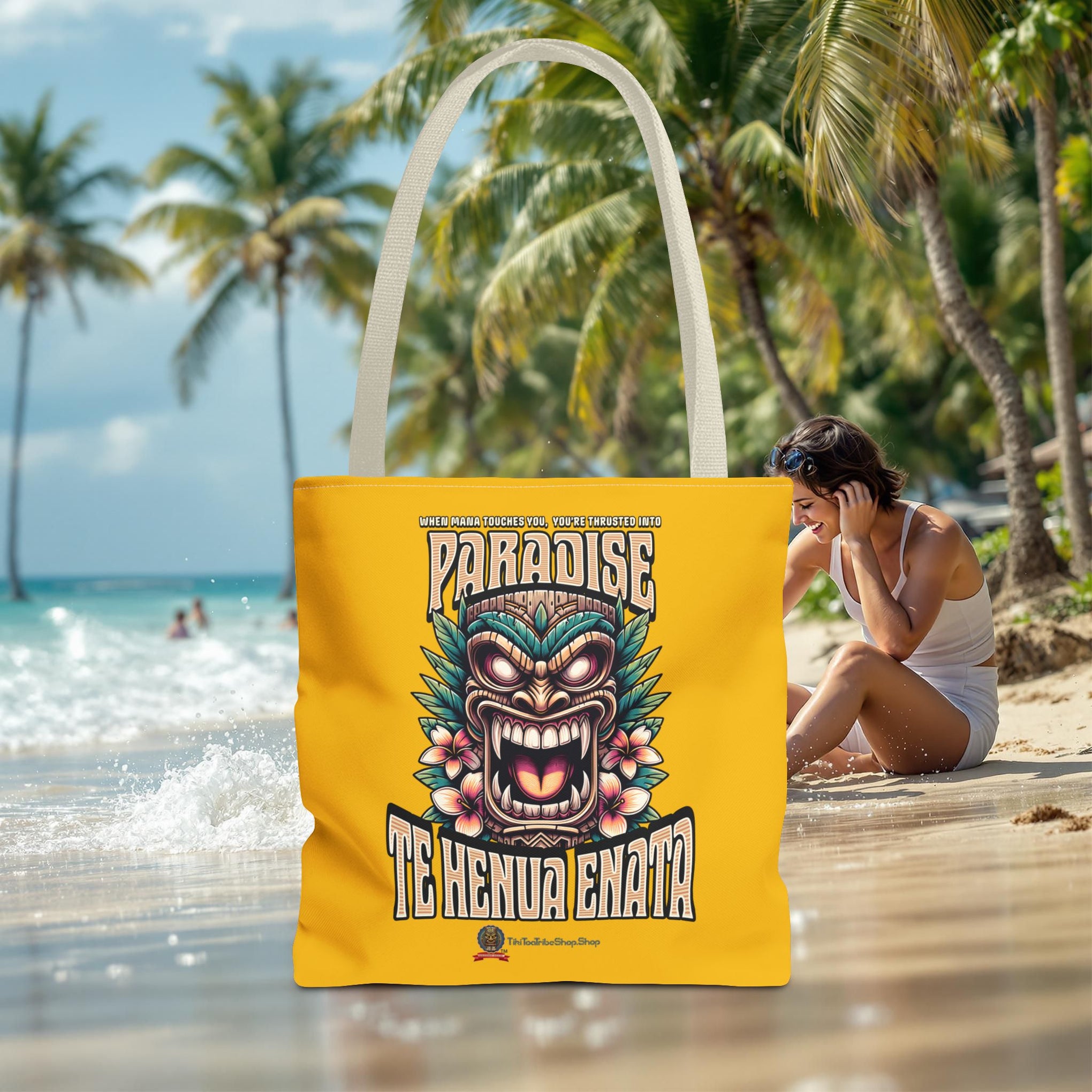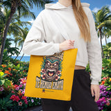 Sac tote bag 'Te Henua Enata Paradise' jaune soleil avec Tiki. Durable, stylé, pour une évasion lumineuse. TIKI TOA TRIBE SHOP.