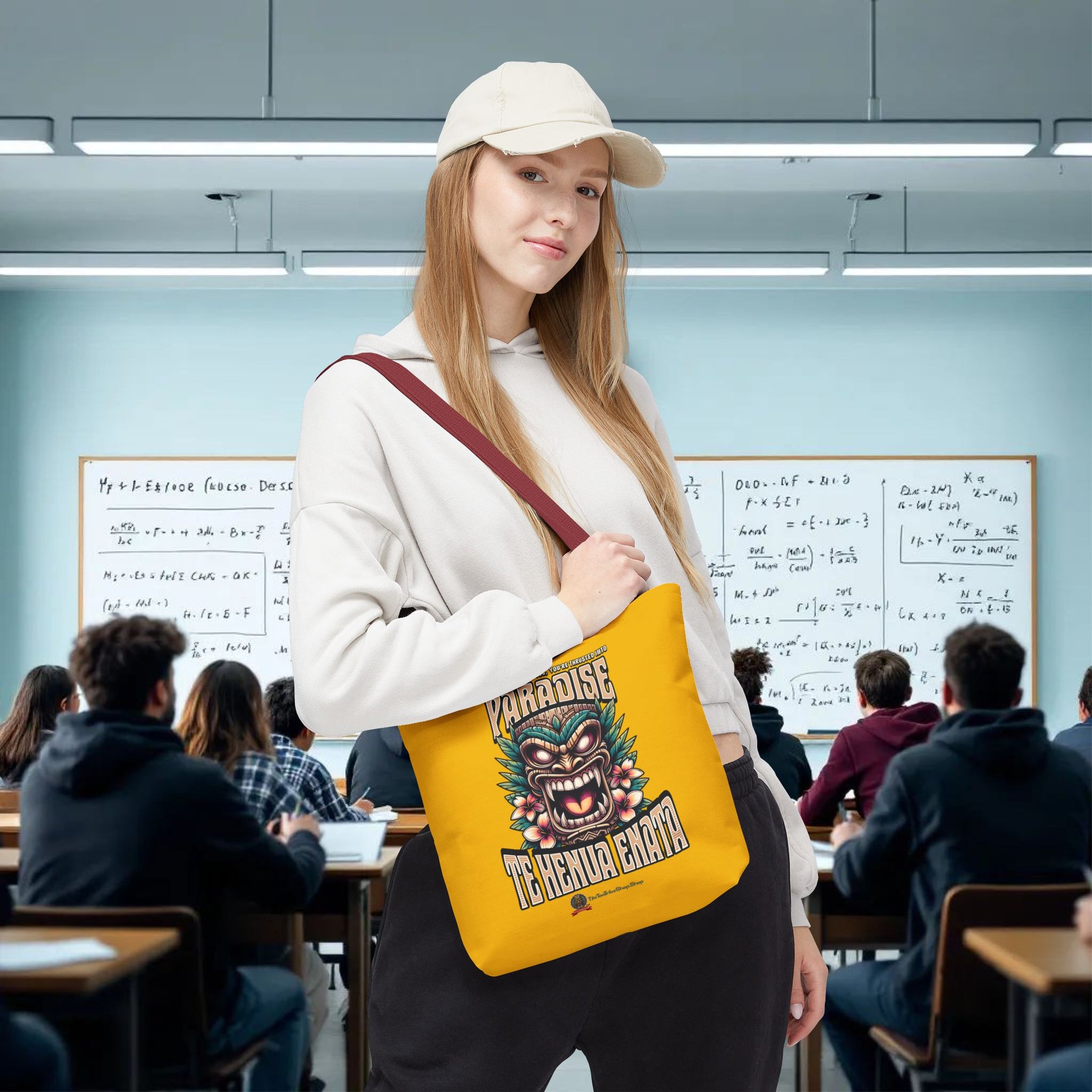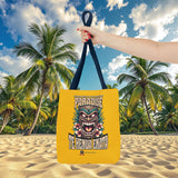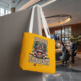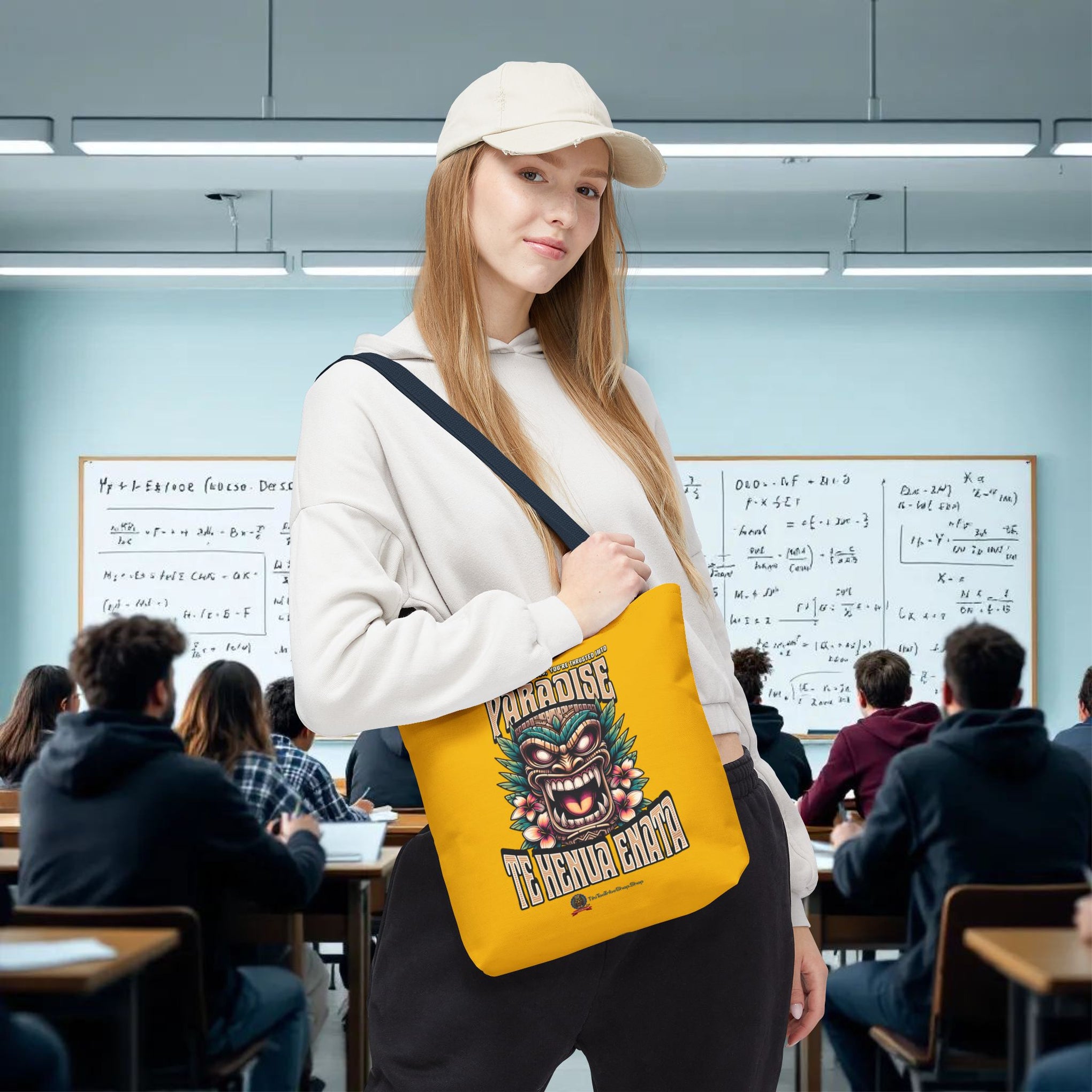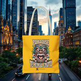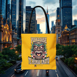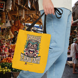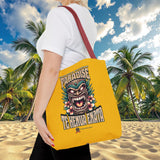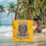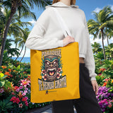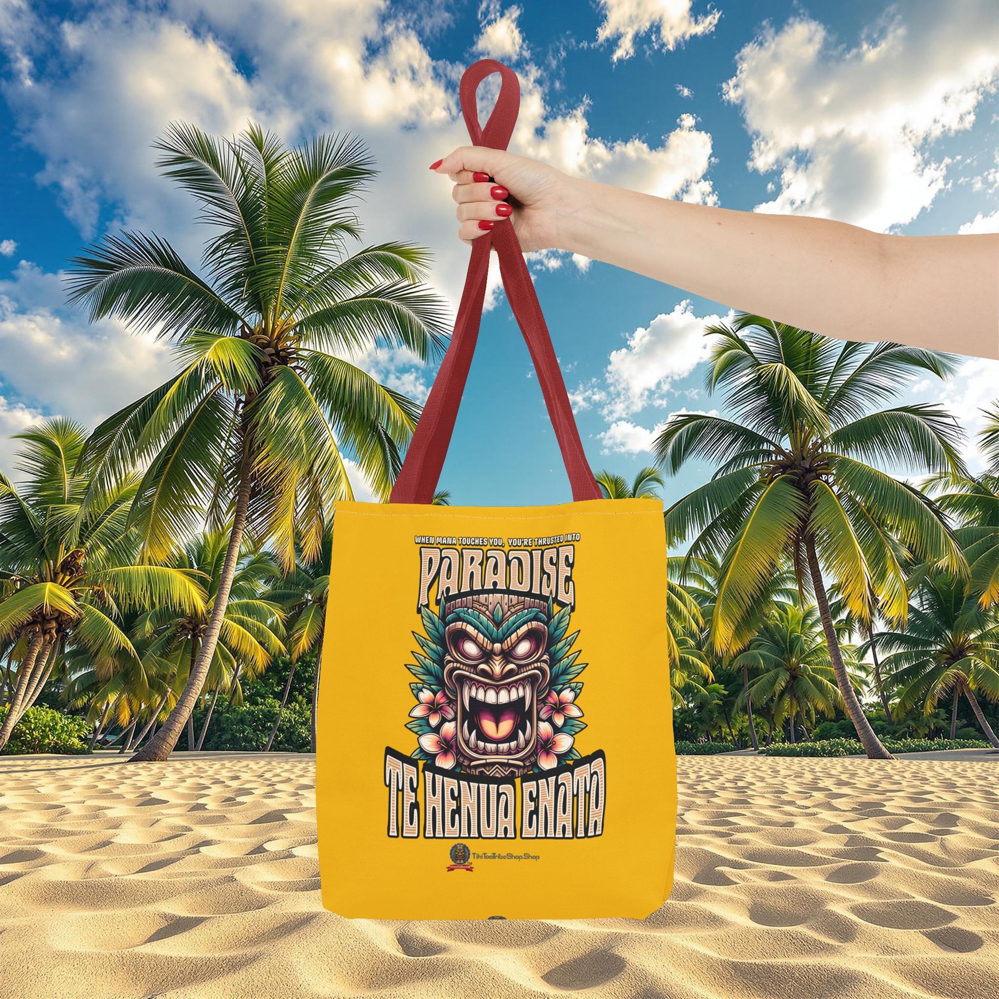 Sac tote bag 'Te Henua Enata Paradise' jaune soleil avec Tiki. Durable, stylé, pour une évasion lumineuse. TIKI TOA TRIBE SHOP.