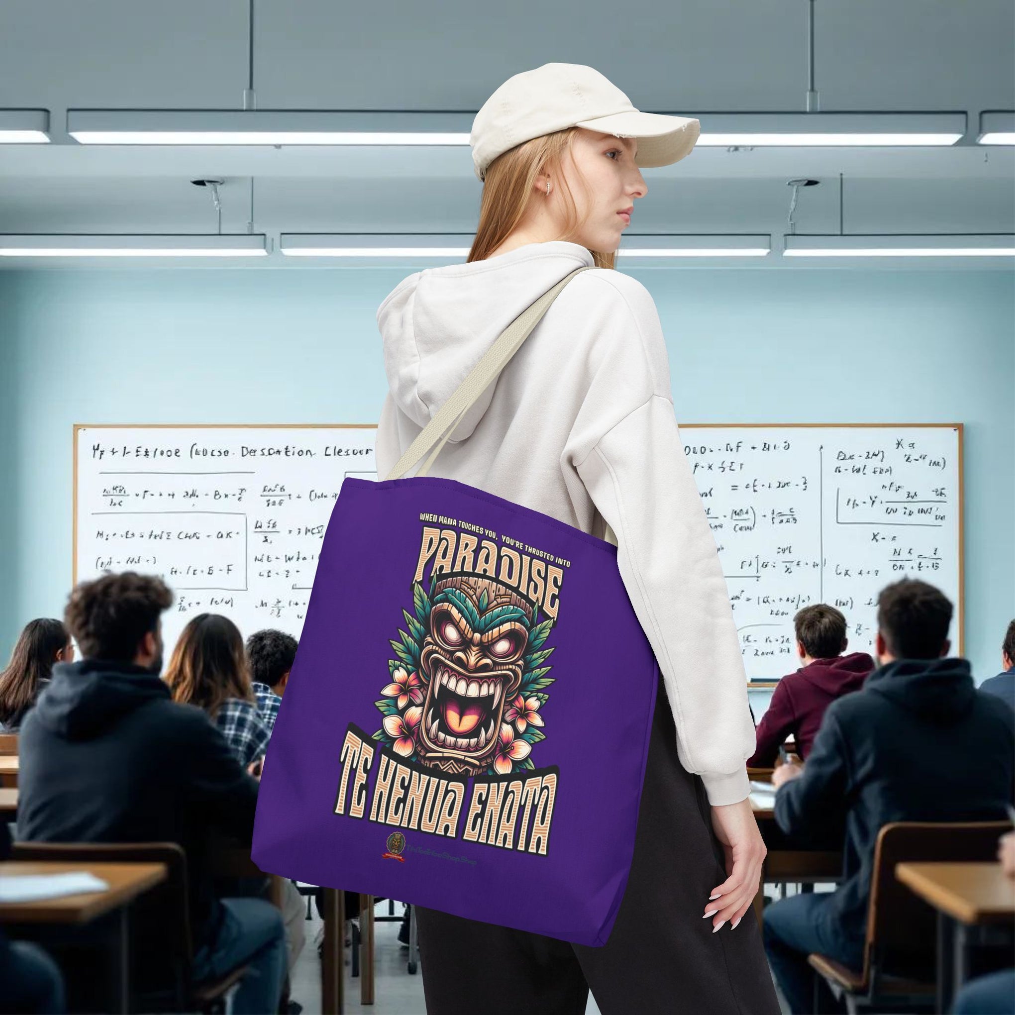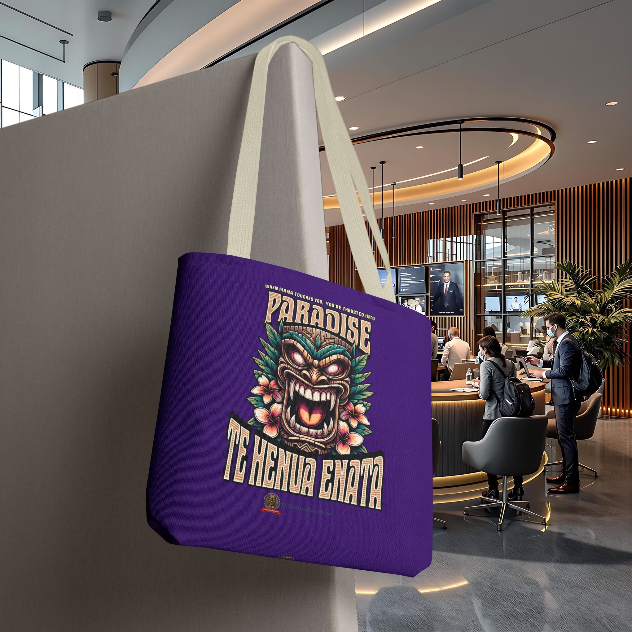 Adoptez l'élégance mystique et la profondeur culturelle avec le Tote Bag 'TE HENUA ENATA PARADISE' Violet Impérial de TIKI TOA TRIBE SHOP ! Ce sac fourre-tout unique est l'accessoire parfait pour celles et ceux qui désirent allier praticité, un design inspirant et l'esprit authentique des îles Marquises.