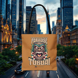 Ancrez votre style dans l'authenticité avec le Tote Bag 'TUBUAI PARADISE' Marron Terre de TIKI TOA TRIBE SHOP ! Ce sac fourre-tout profond est l'accessoire parfait pour celles et ceux qui désirent allier praticité, un design inspirant et la connexion à la terre des îles polynésiennes.
