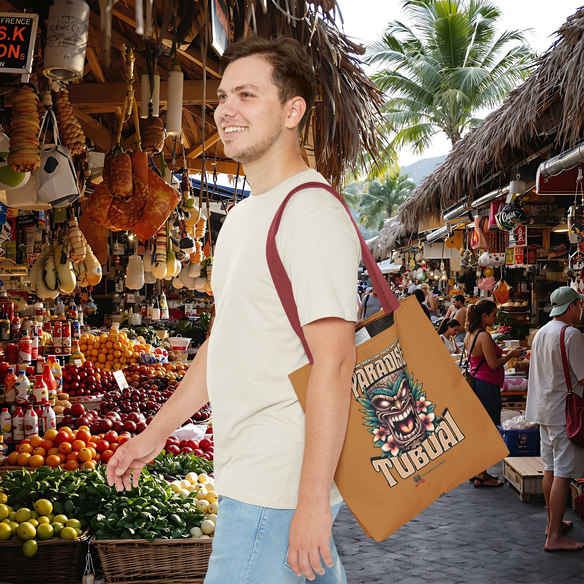 Emportez la beauté profonde et l'authenticité de Tubuai avec le Tote Bag 'TUBUAI PARADISE' Marron Terre de TIKI TOA TRIBE SHOP. Votre paradis personnel, avec une touche de nature et de caractère, vous attend !