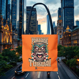 Emportez la beauté vibrante de Tubuai avec le Tote Bag 'TUBUAI PARADISE' Orange Tropic de TIKI TOA TRIBE SHOP. Votre paradis personnel, avec une touche de chaleur insulaire, vous attend !