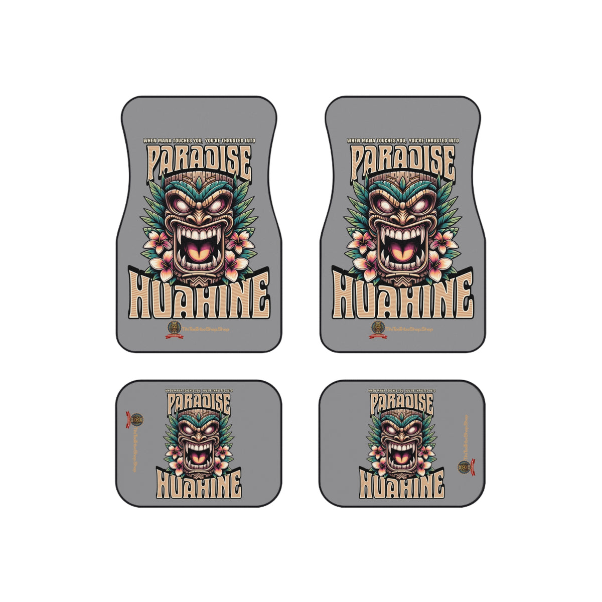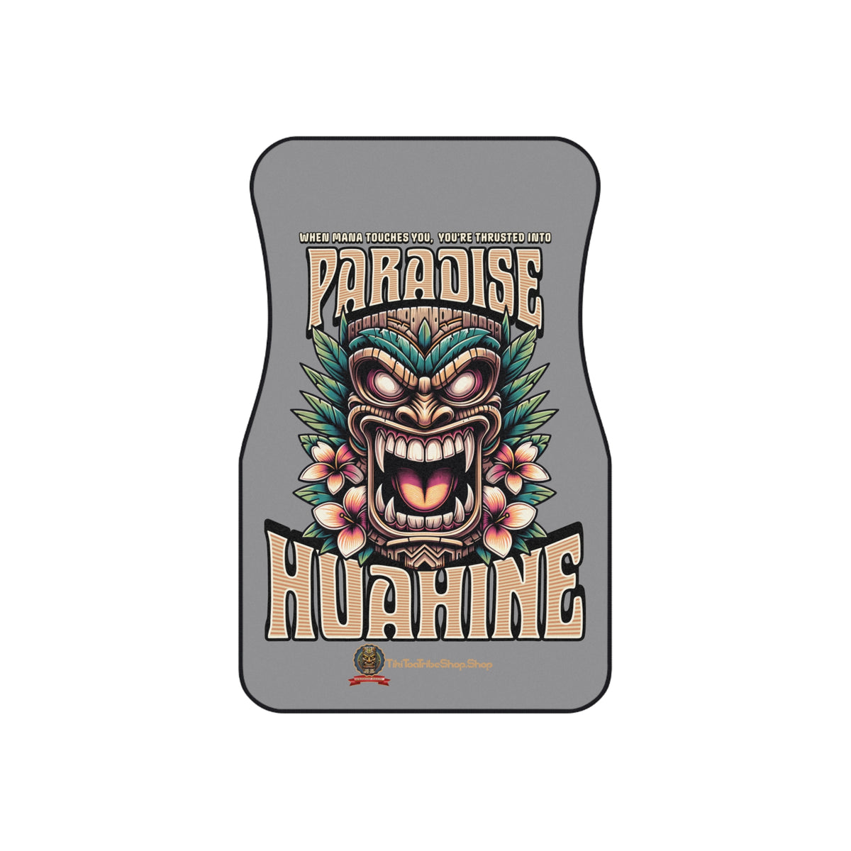 “Huahine” inscription in stylized letters, paying homage to the wild and mystical island with enchanting landscapes.