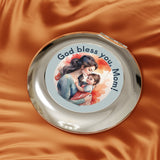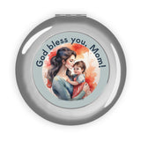 Celebrate unconditional love with our "God bless you, Mom!" handheld mirror. This enchanting accessory features a mother tenderly embracing her child, a powerful symbol of love, protection, and family. The stained-glass-inspired design, with its soft colors and shimmering light, is a true invitation to embrace change and growth.