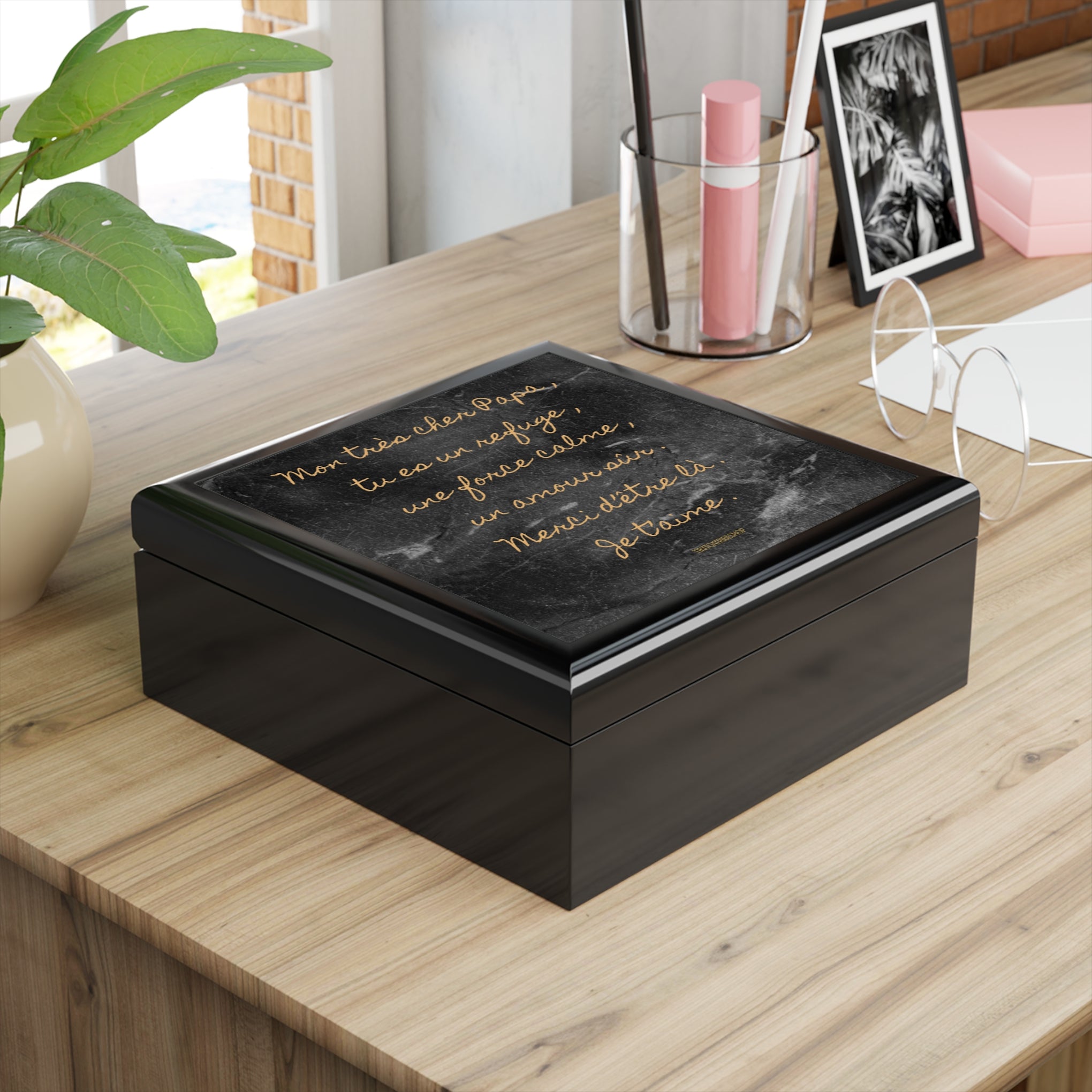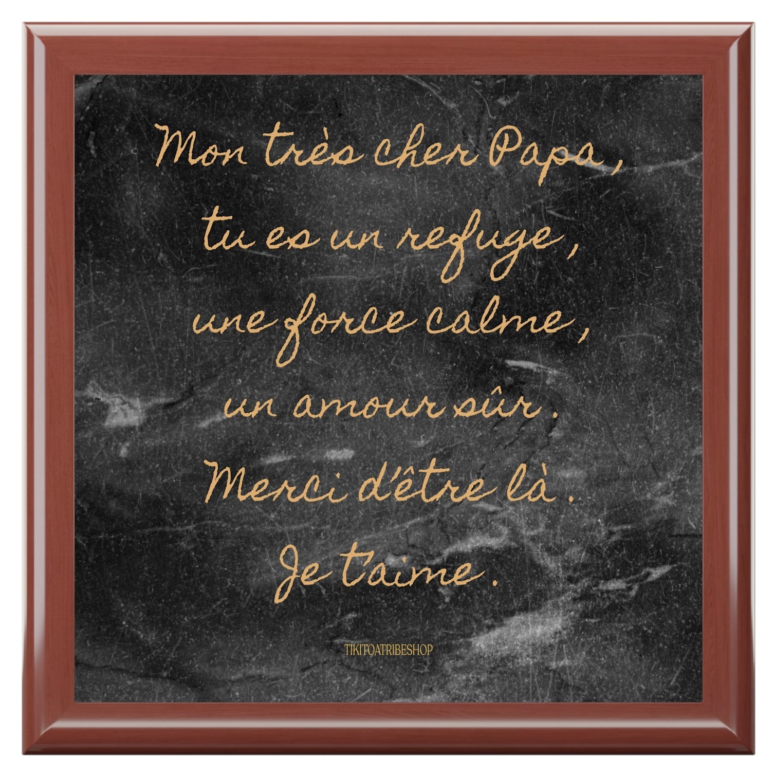 Coffret Ă  Bijoux en bois noble avec carreaux cĂ©ramique ‹ Mon trĂšs cher Papa , tu es un refuge , une force calme , un amour sĂ»r . Merci d’ĂȘtre lĂ  . Je t’aime .