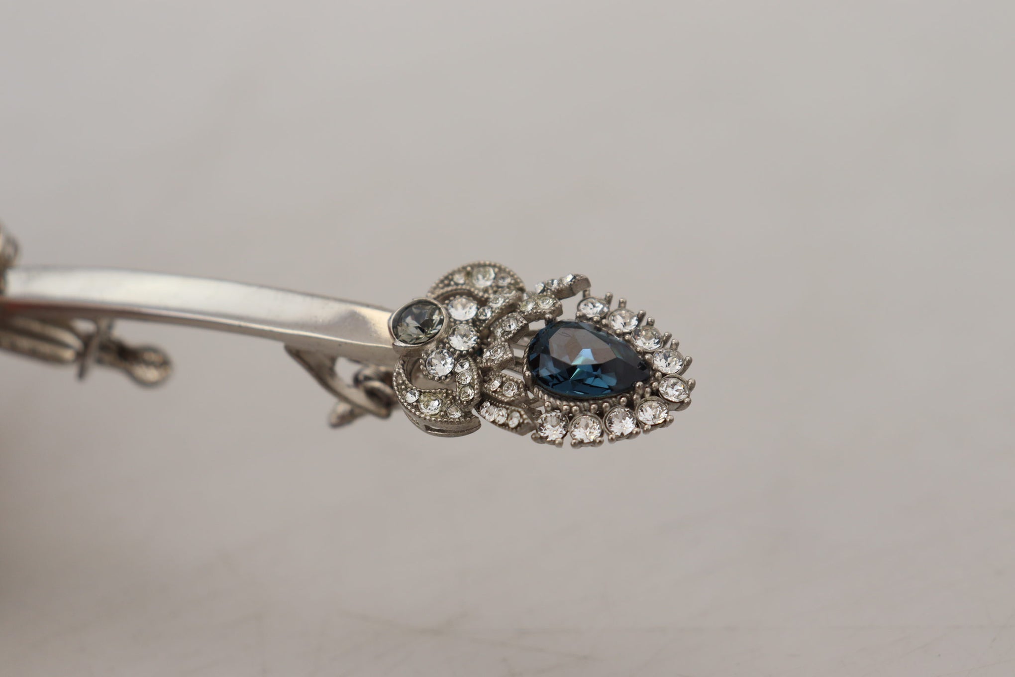 Les accessoires, comme cette broche, sont des éléments clés de l'esthétique Dolce & Gabbana, ajoutant une touche de luxe et de personnalité. L'utilisation d'argent sterling 925 est un gage de qualité dans la bijouterie, indiquant une composition de 92,5% d'argent pur, ce qui la rend durable et résistante à l'oxydation. Les éléments en verre sont souvent utilisés pour imiter des pierres précieuses, offrant un éclat similaire à un coût plus abordable. La conception de cette broche, avec son apparence "vintage" et ses formes élaborées, rappelle souvent les bijoux anciens ou de la royauté, reflétant l'inspiration historique et culturelle que Dolce & Gabbana intègre dans ses créations.